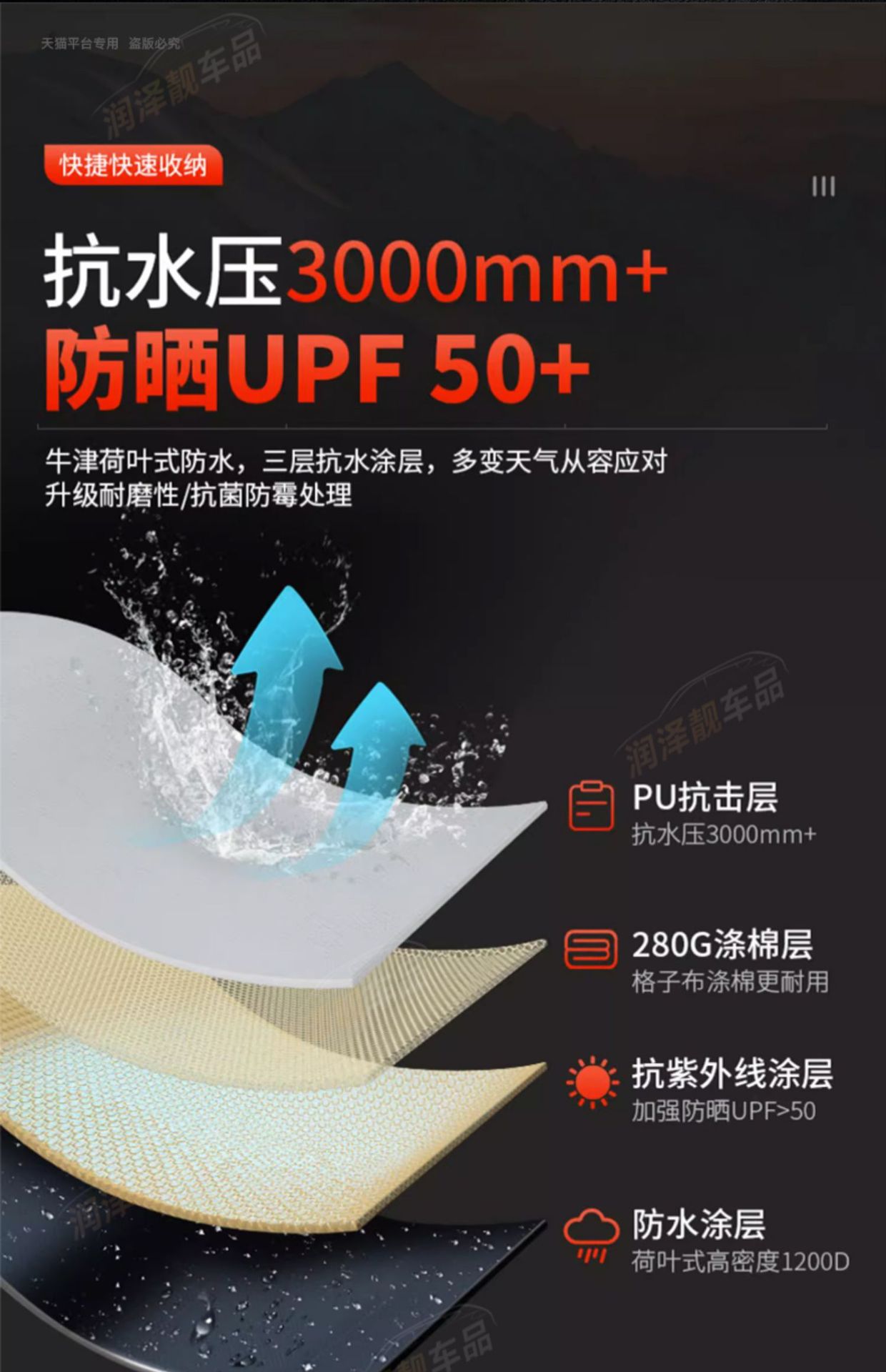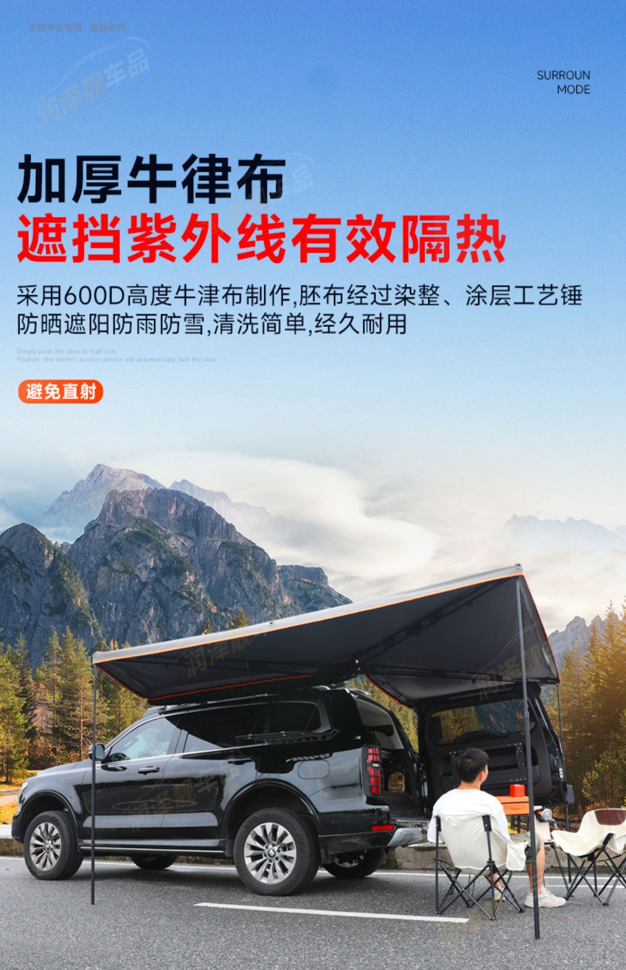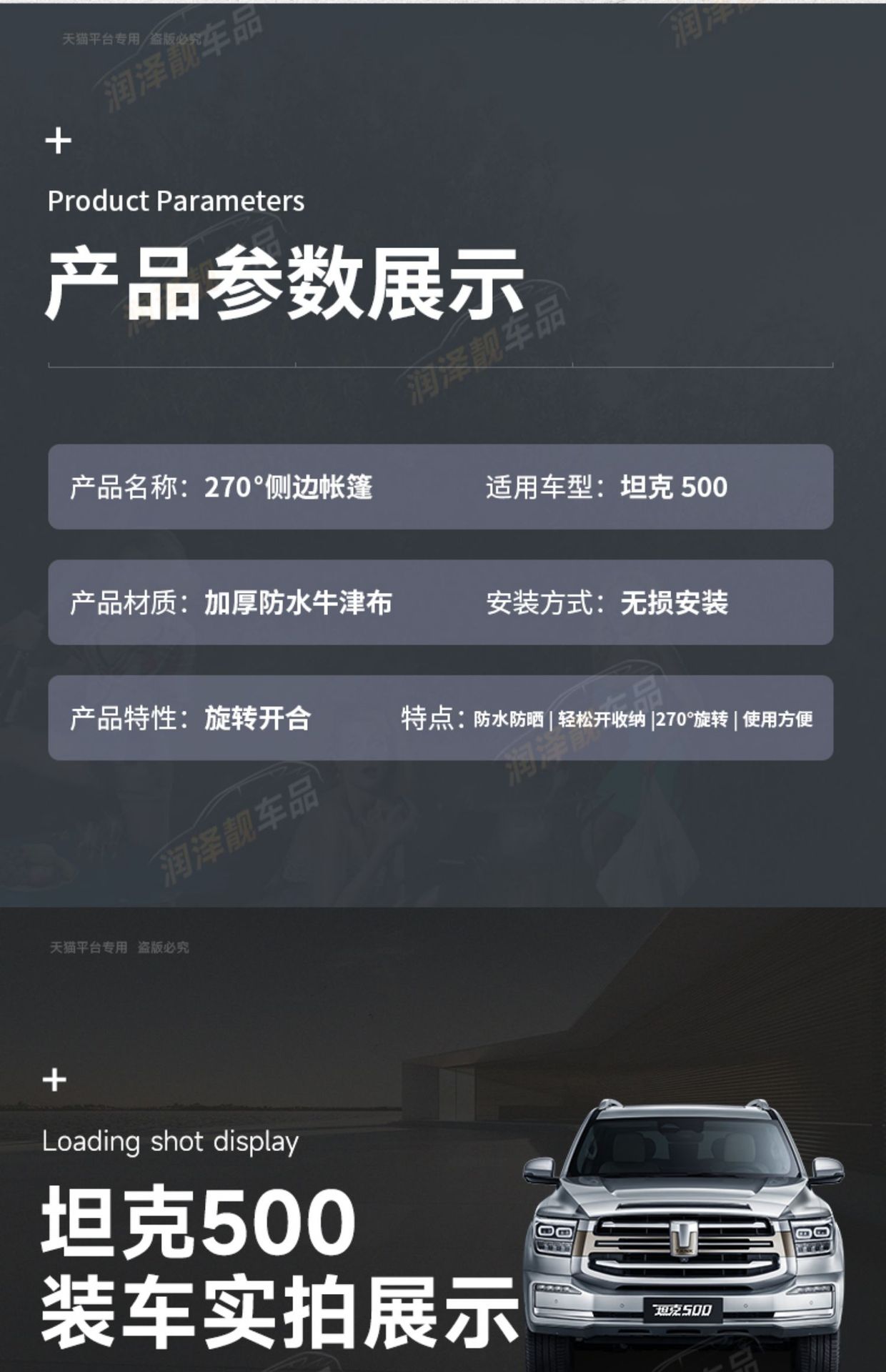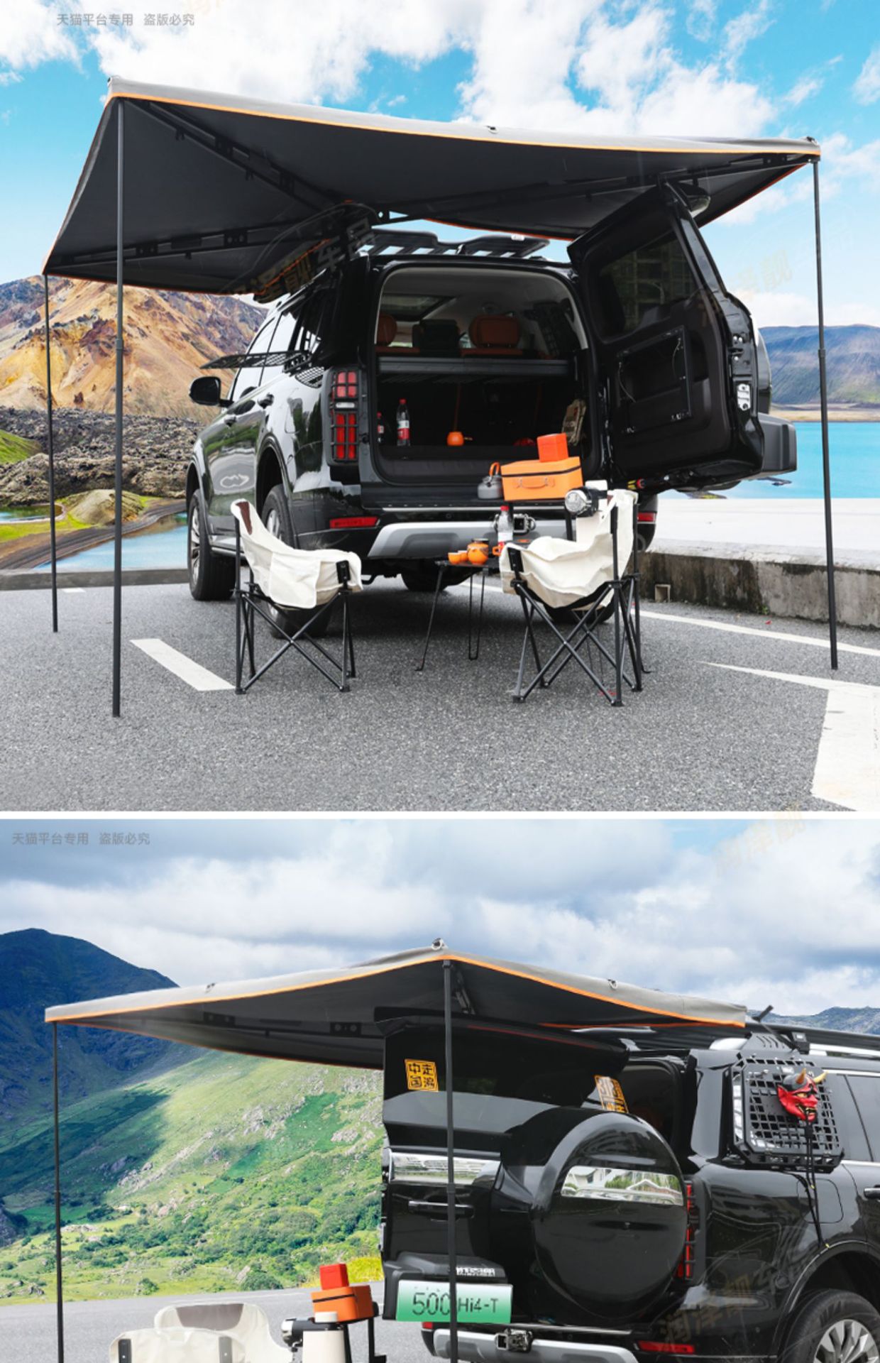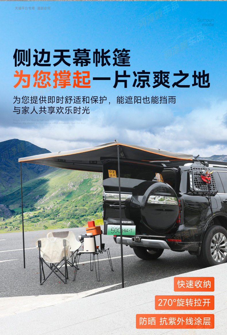 Upgrade your outdoor adventure with this 270-degree waterproof fan-shaped vehicle awning. Designed for Tank 500 Hi4-T and SUVs, providing reliable rain and sun protection.
