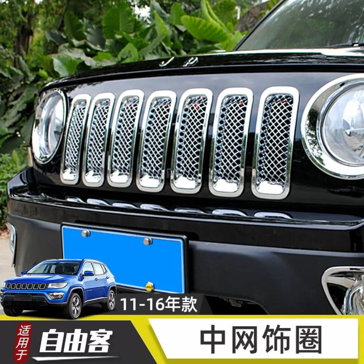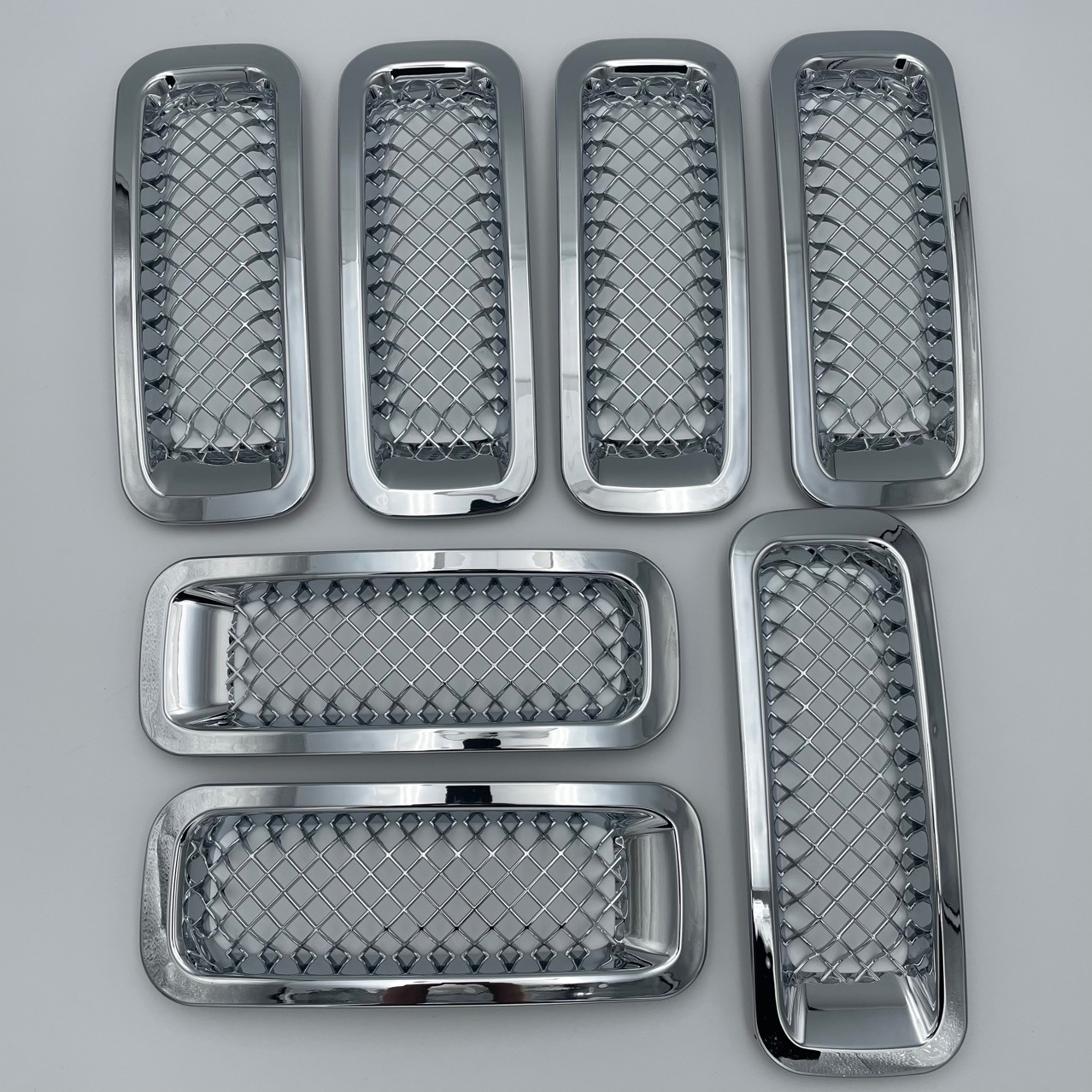 Enhance your 2011-2016 Jeep Patriot with this 7-piece chrome front grille ring set. Features integrated insect-proof mesh for protection and premium electroplated finish.