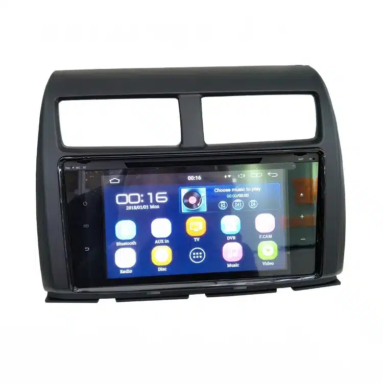 - Standard double DIN design allows for straightforward integration into compatible dashboard slots for Perodua Myvi models.