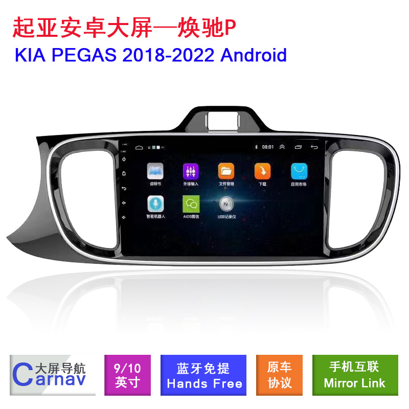 Upgrade your Kia Pegas 2018-2022 with this 9-inch Android GPS navigation system. Features Bluetooth, touch screen, and backup camera support for modern driving.