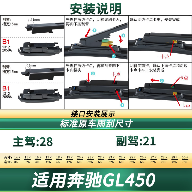 - Precise fitment designed specifically for Mercedes-Benz GL 450 original wiper arm interfaces.