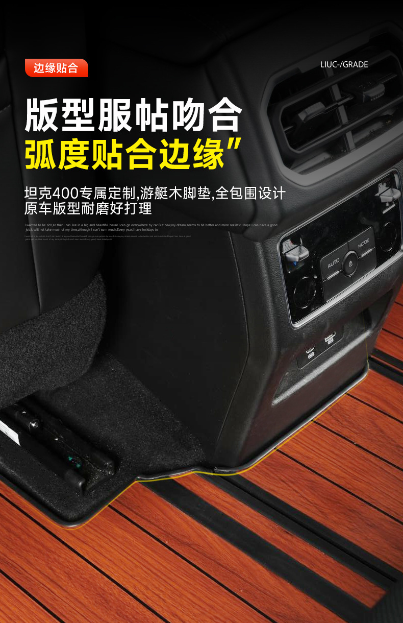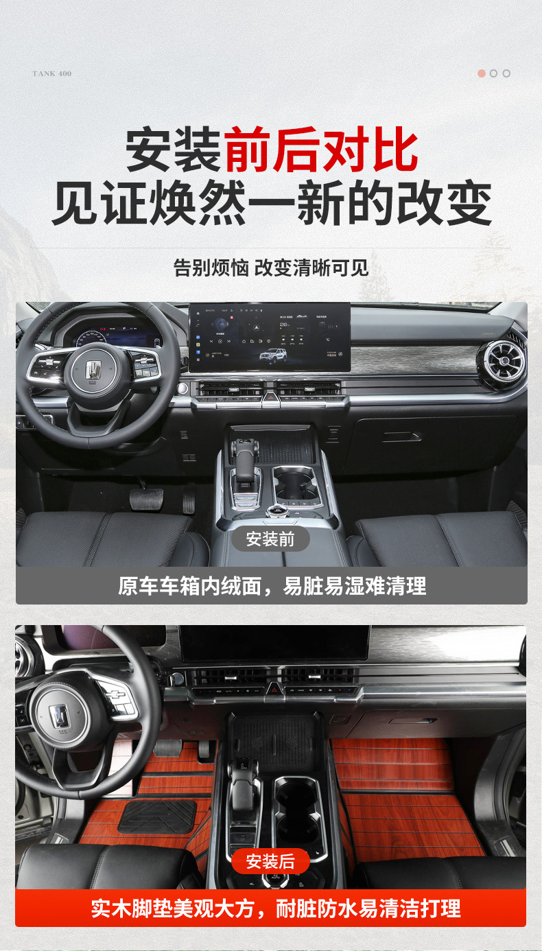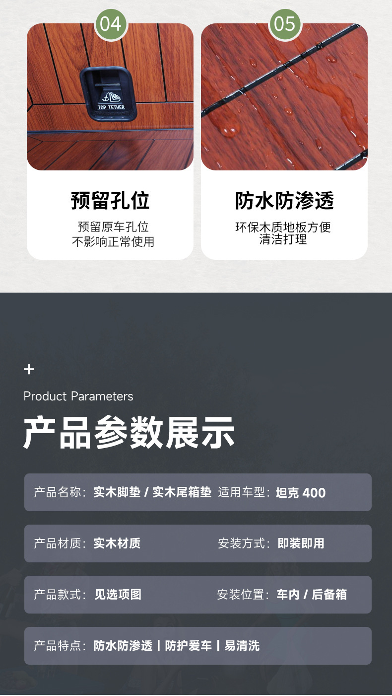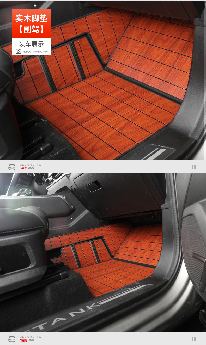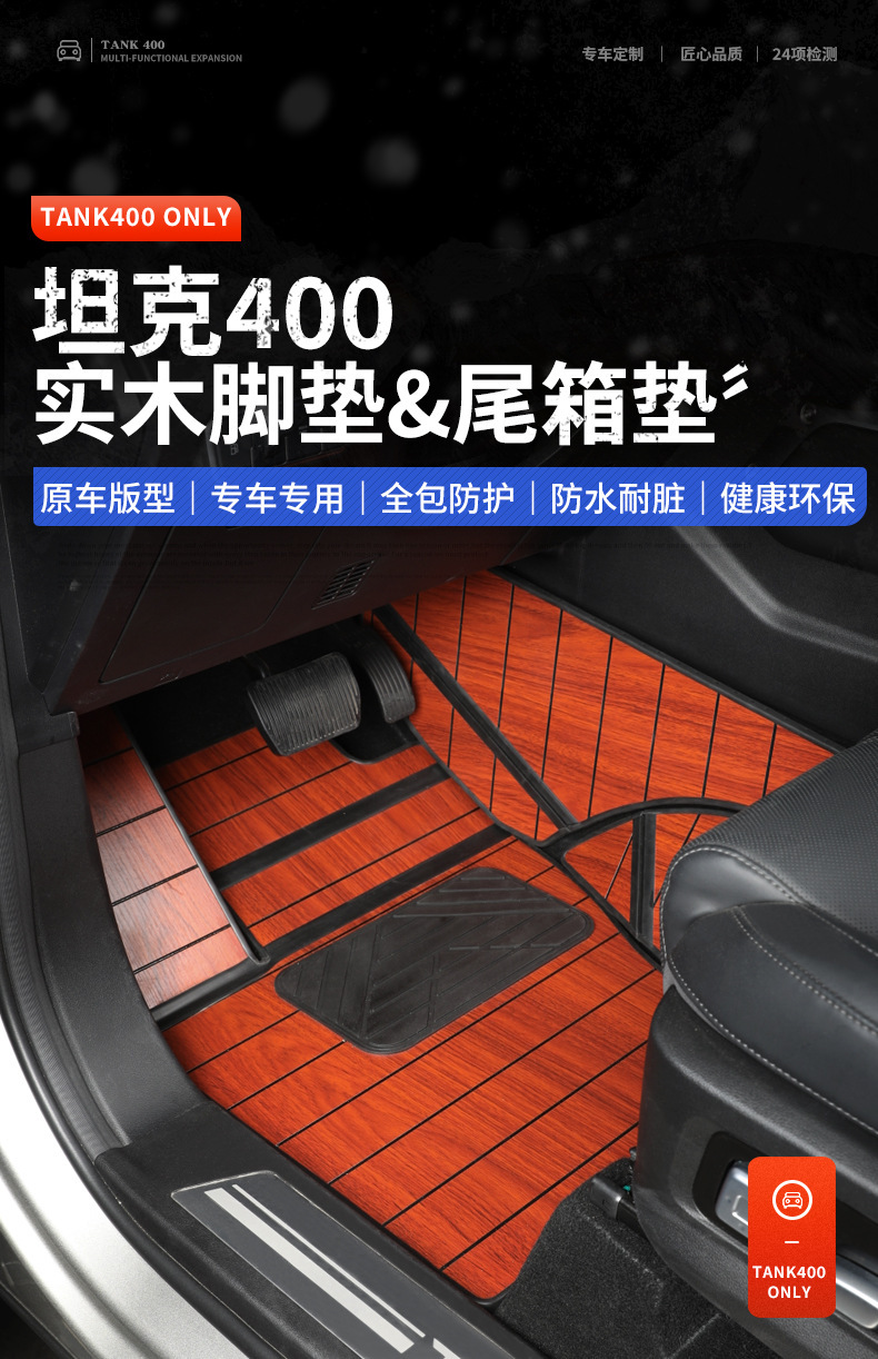 Upgrade your Tank 400 Hi4-T with premium 5D floor mats and trunk liners. Durable, waterproof, and featuring a unique wood grain style for full interior protection.