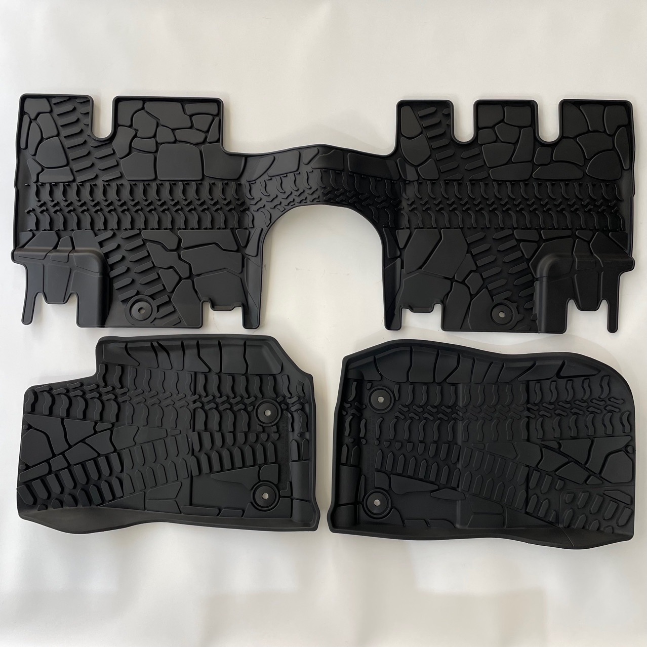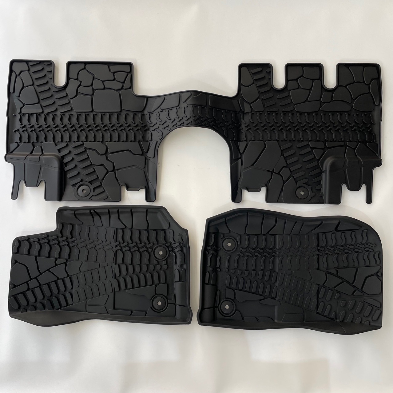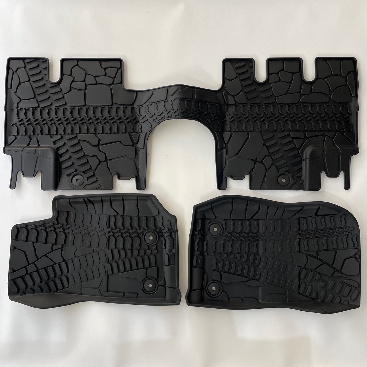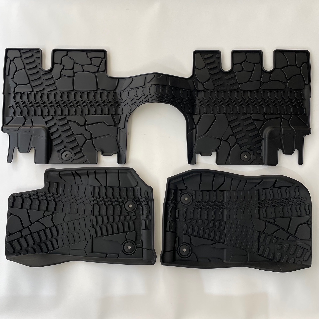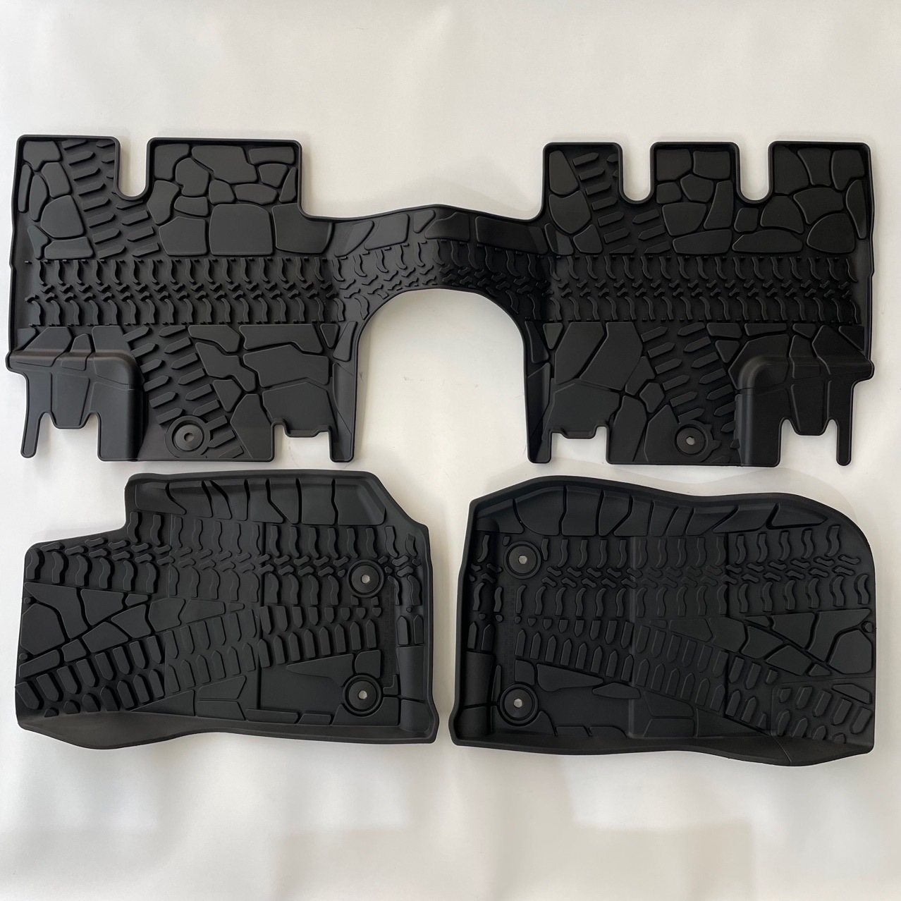 A: The mats feature molded-in retention holes that snap directly onto your Jeep's factory floor posts, ensuring they remain safely anchored at all times.