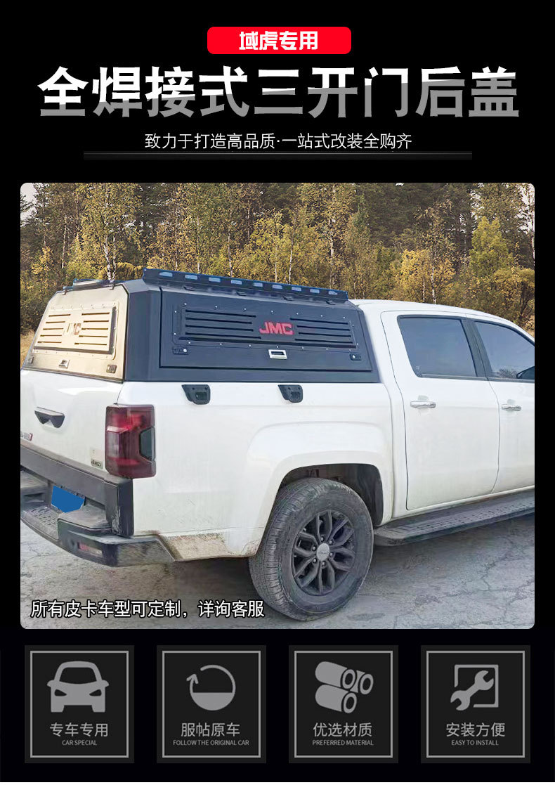 Upgrade your pickup with this all-welded three-door truck bed canopy. Designed for JMC Yuhu and Baodian models, it offers secure, weather-resistant cargo protection.