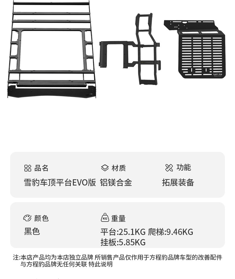 Be the first to review “Aluminium Alloy Roof Platform Rack with Side Mounting Plate and Rear Ladder for Fang Cheng Bao 5 Off-Road Modification” Cancel reply