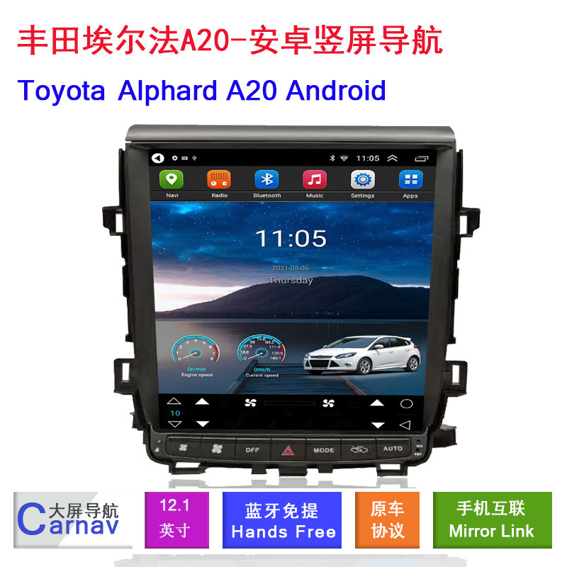 Upgrade your Toyota Alphard A20 with this high-performance Android multimedia player featuring GPS navigation, 360 camera compatibility, and a vertical HD screen.