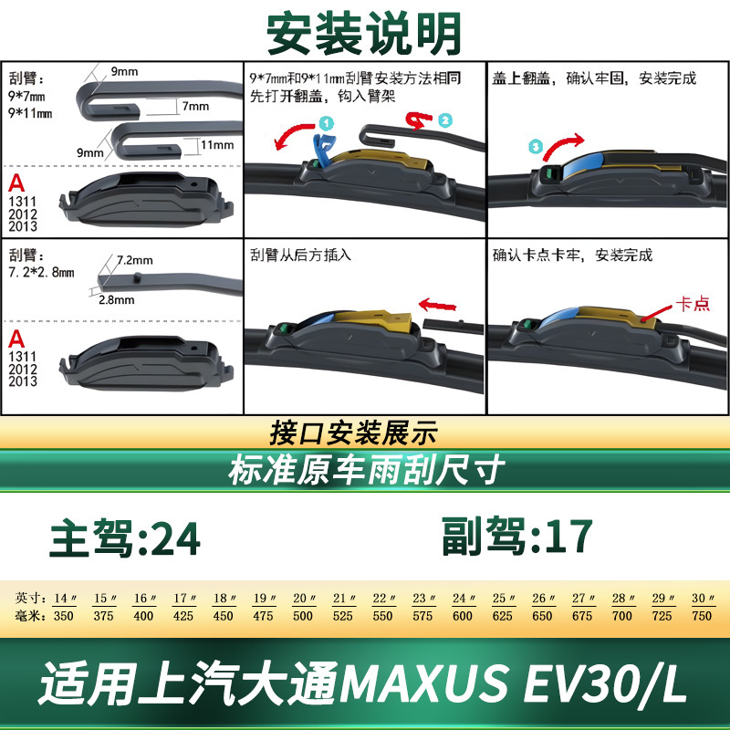 Upgrade your driving safety with our premium boneless silent rubber wiper blades compatible with SAIC Maxus EV30/L. Durable, quiet, and easy to install for clear vision.
