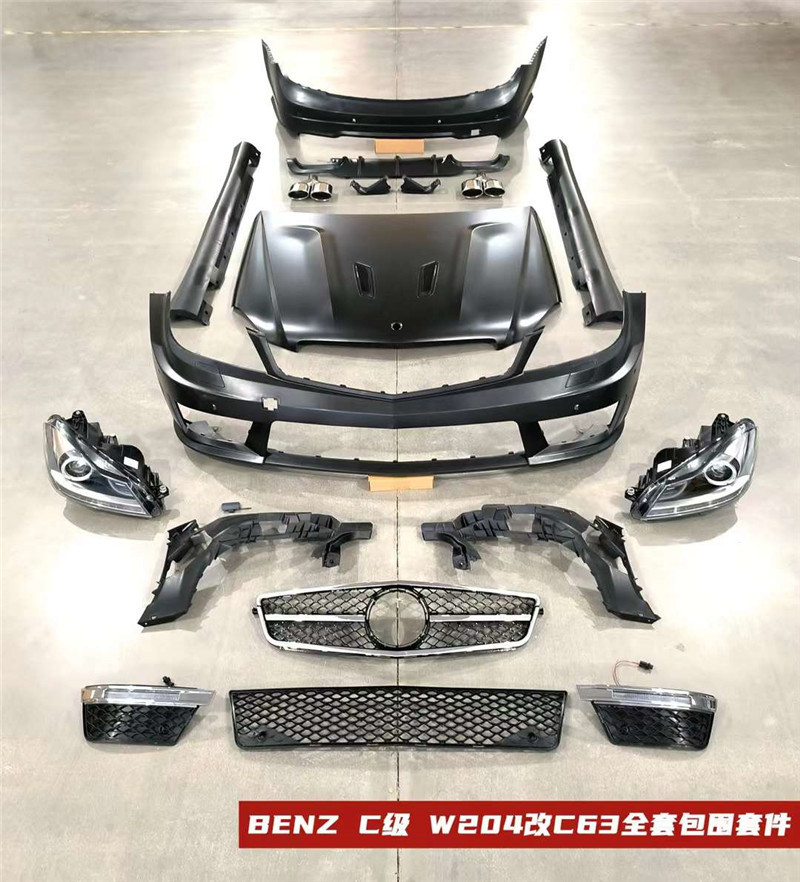 Upgrade your Mercedes C-Class W204 (2008-2013) with this C63 style body kit featuring a front bumper, engine hood, and headlights for a premium, sporty look.