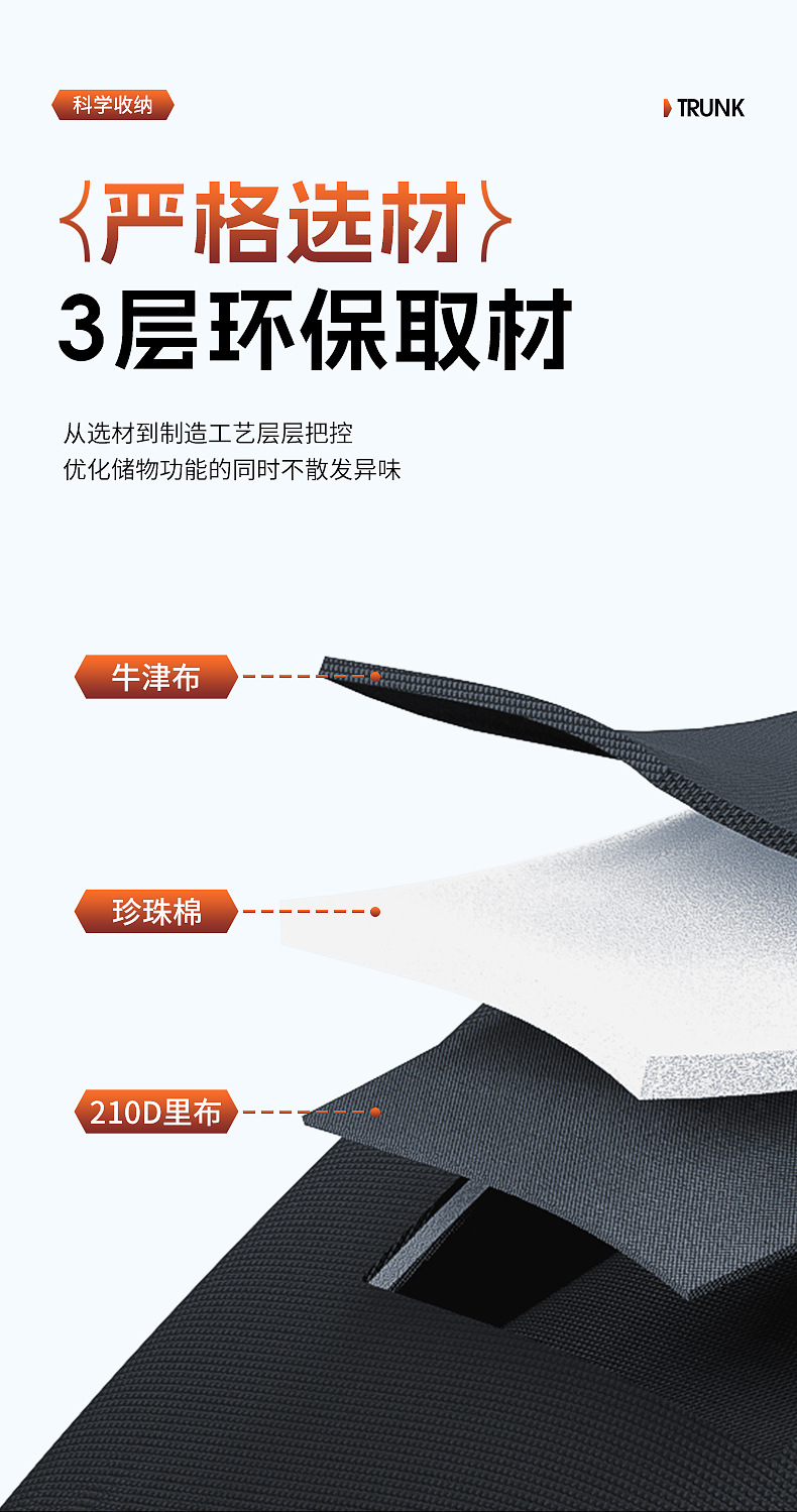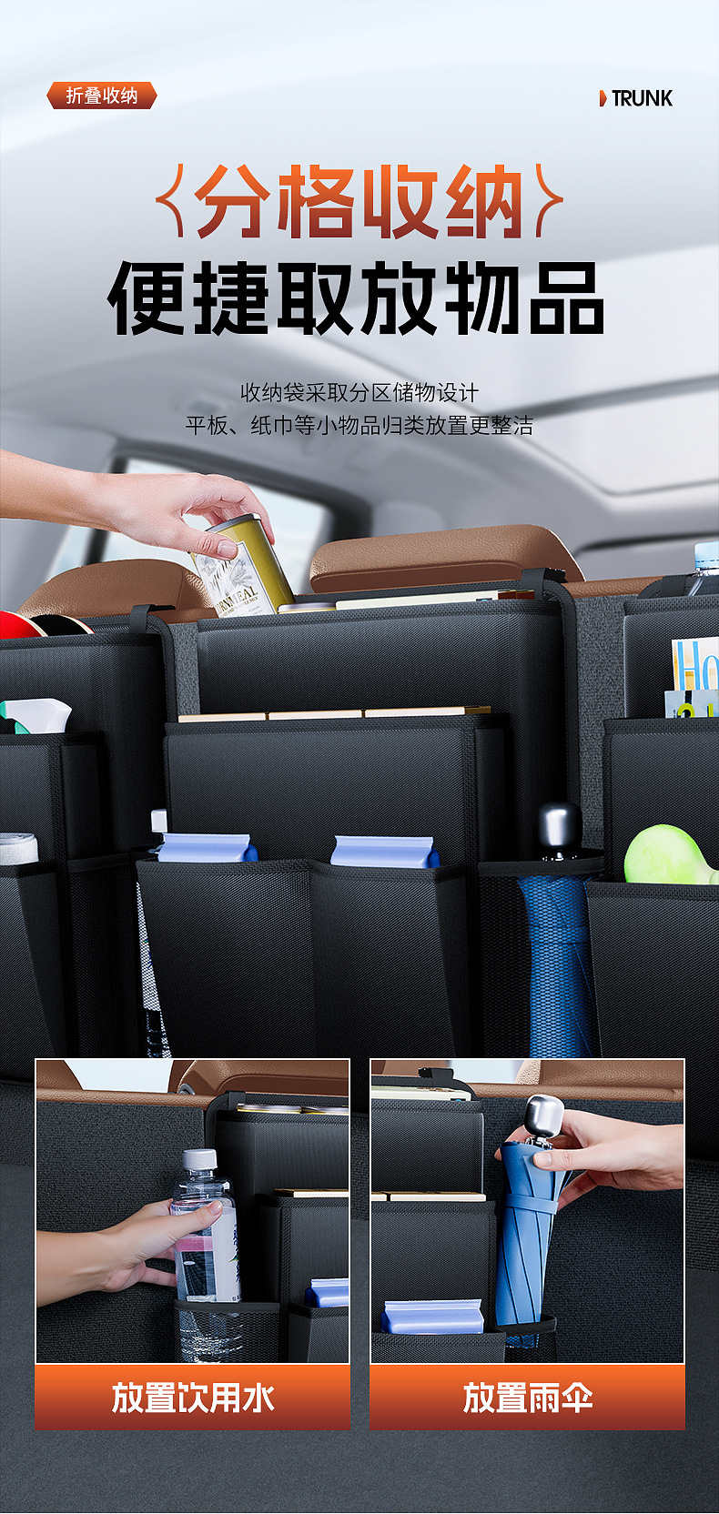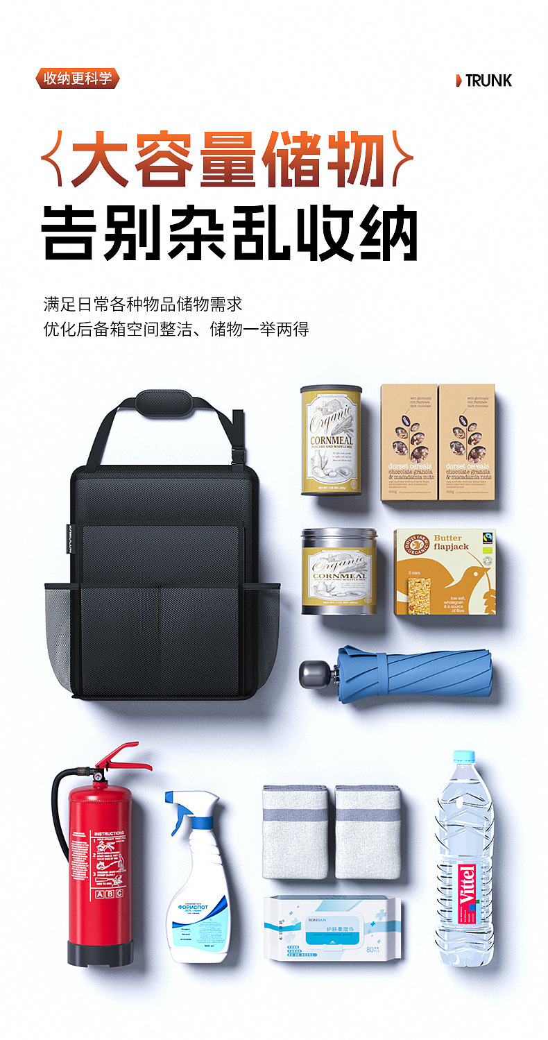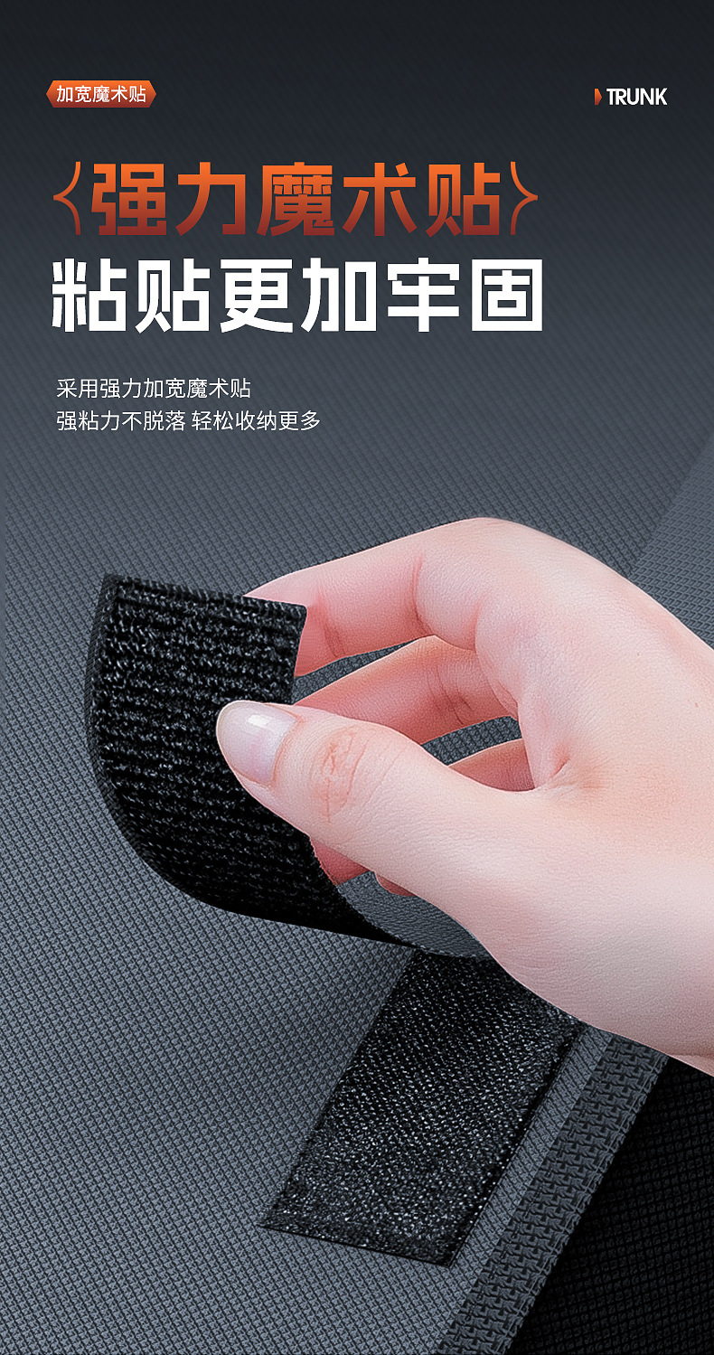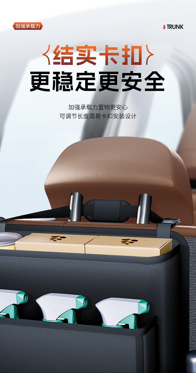 - Maximizes trunk space by utilizing the back of the rear seats for organized storage.