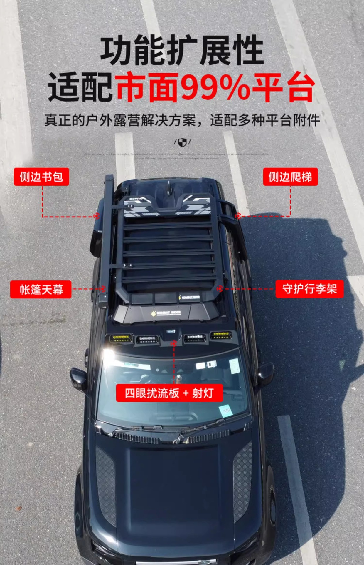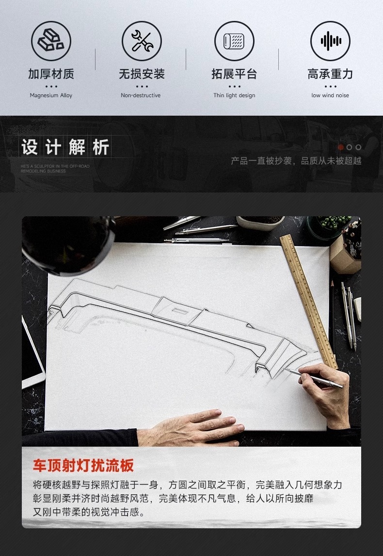 - Streamlined aerodynamic profile minimizes wind noise and drag when driving at high speeds on highways or rough terrain.
