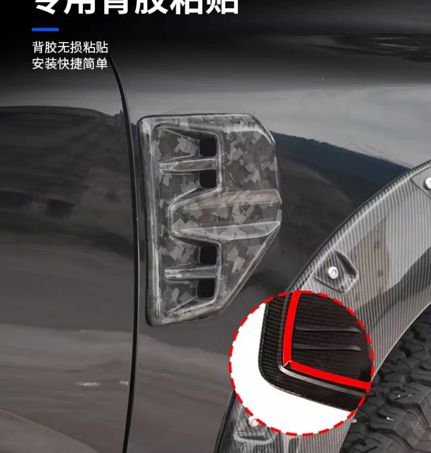Upgrade your Ford Ranger with these forged carbon fiber style fender side air intake vents. Easy non-destructive installation for a premium, sporty exterior look.