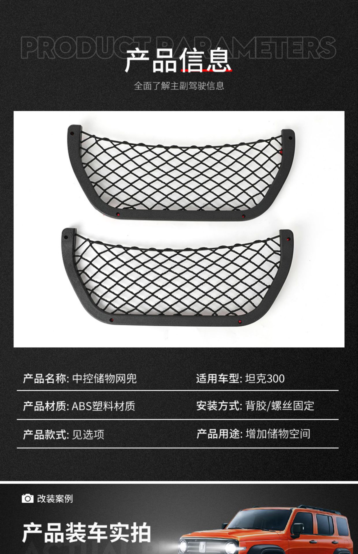 Center Console Storage Net Mesh Bag for Tank 300 Interior Organizer Side Seat Pocket Upgrade