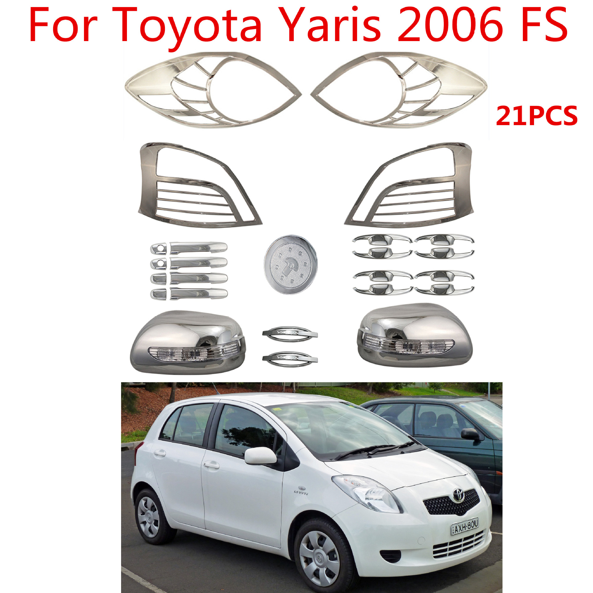 Tags: ABS exterior accessories, car door handle cover, car styling parts, chrome trim kit, fuel tank cap trim, Yaris chrome accents