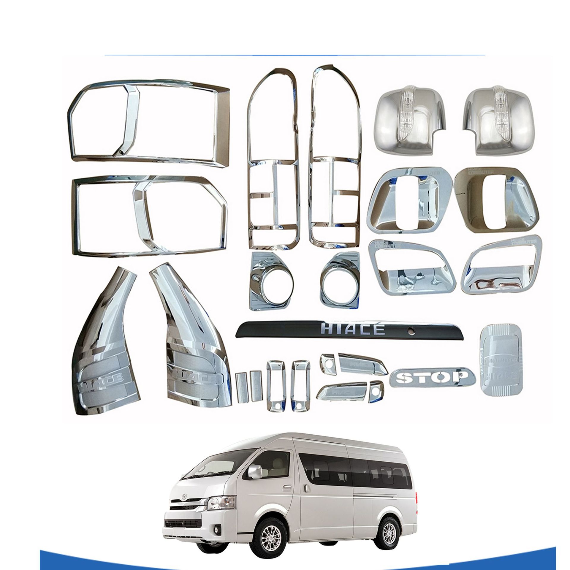 Tags: automotive chrome accessories, car exterior trim, door bowl guard, door handle covers, mirror protector, Toyota Hiace chrome kit, van styling kit