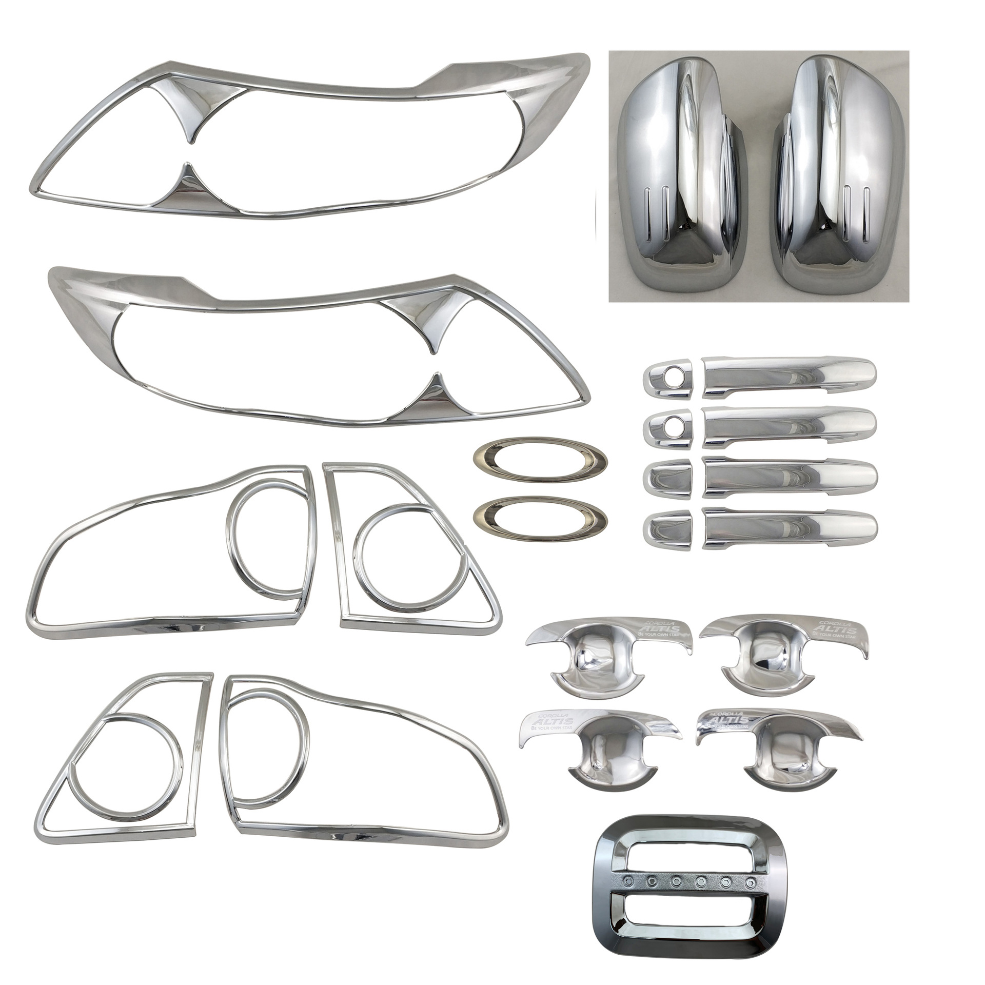 Enhance your 2008 Toyota Corolla with this premium chrome exterior trim set including door handle covers and side mirror protectors for a sleek, modern look.