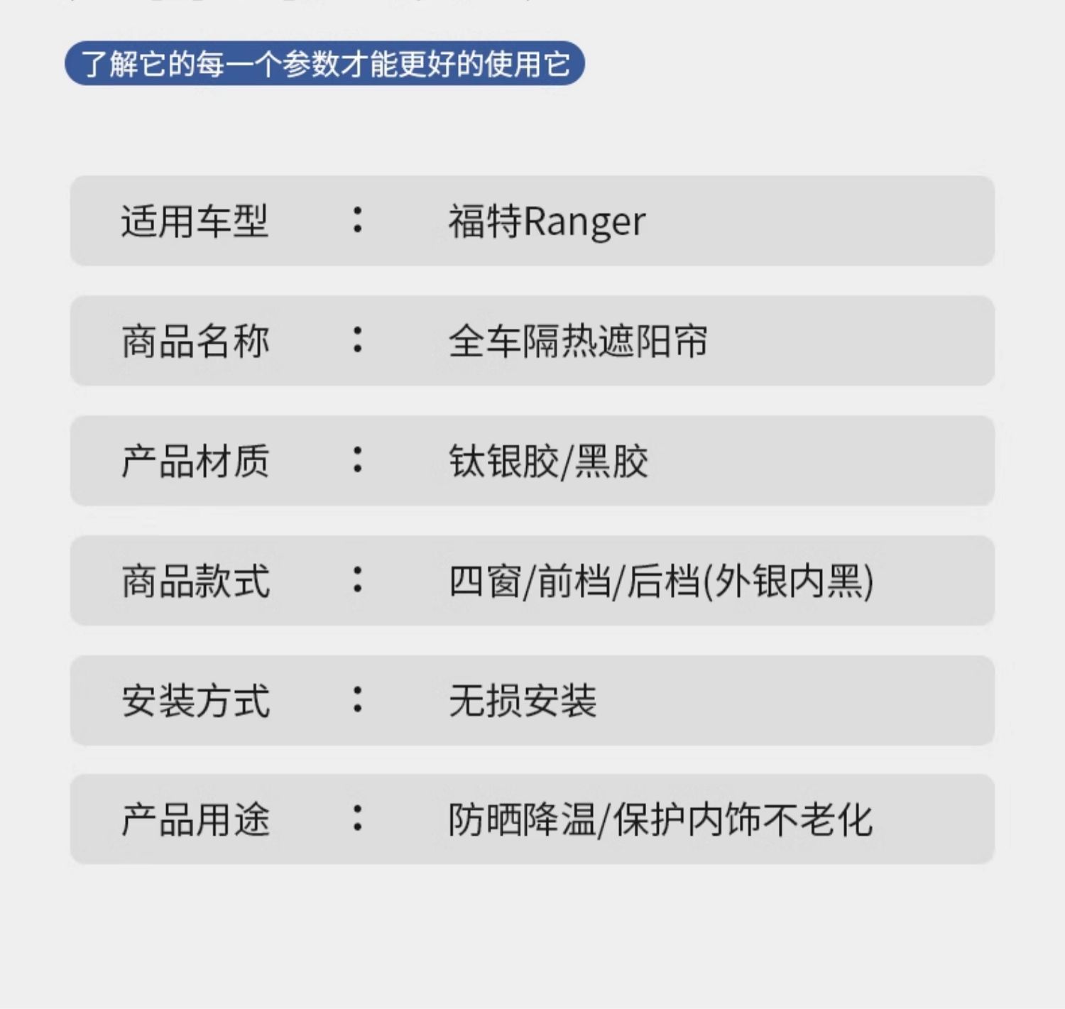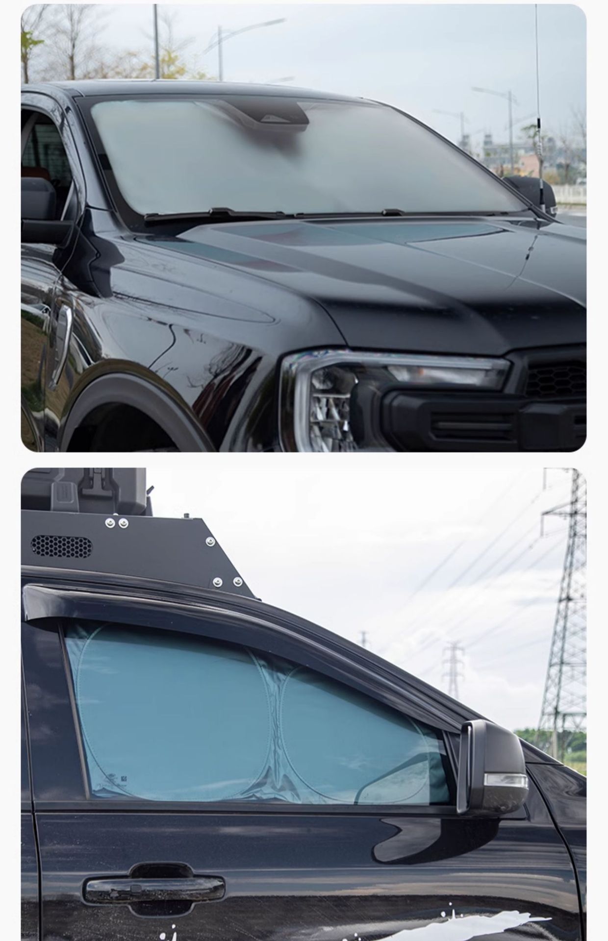 Protect your Ford Ranger from UV damage and heat with this custom sunshade set. Includes front, side, and rear window covers for maximum cooling and privacy.