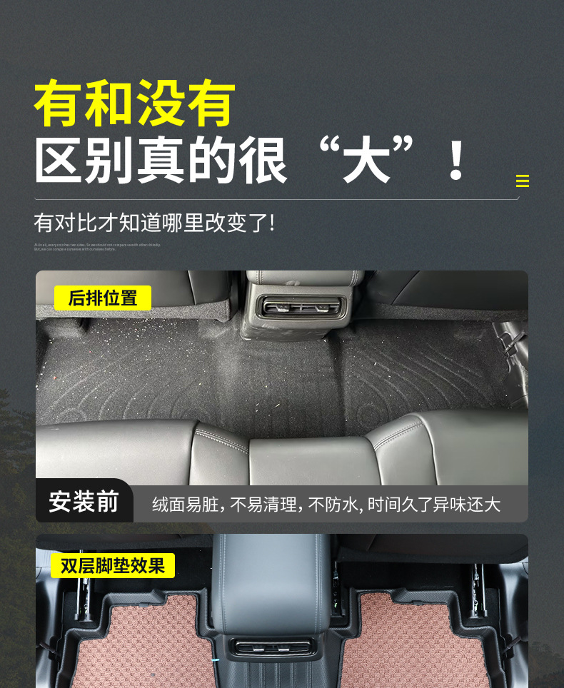 - Enhanced deep grooves and raised edges trap liquids and debris effectively preventing damage to the original vehicle carpet.