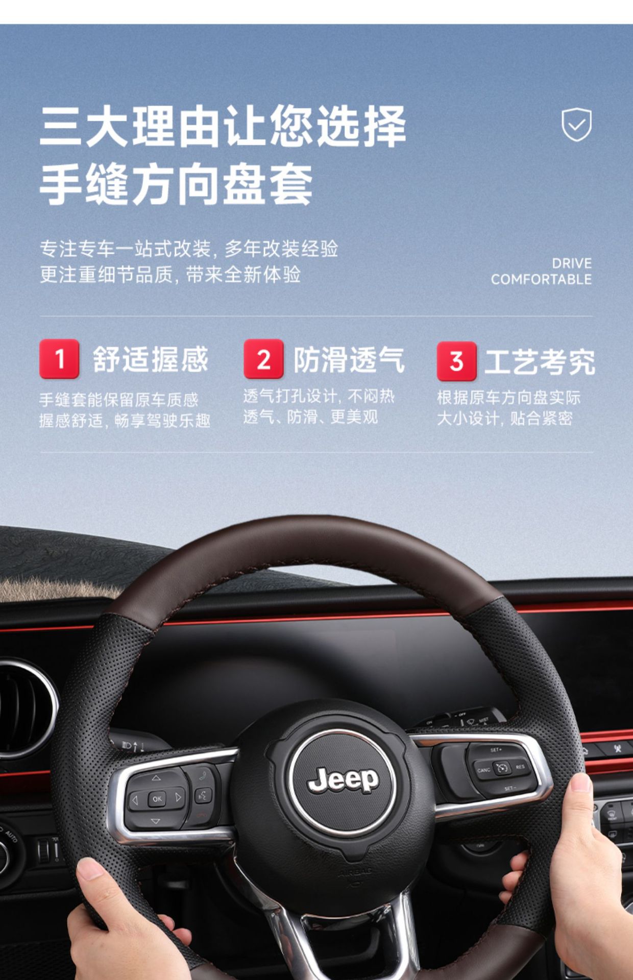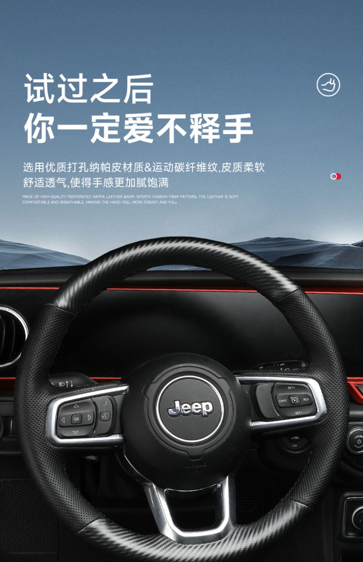 Upgrade your Jeep Wrangler JL 2018-2023 with this custom hand-stitched steering wheel cover. Durable, non-slip material provides protection and a premium feel.