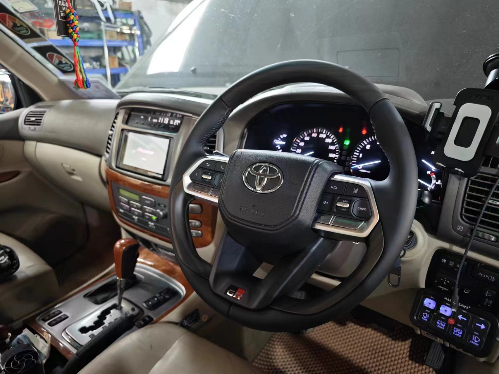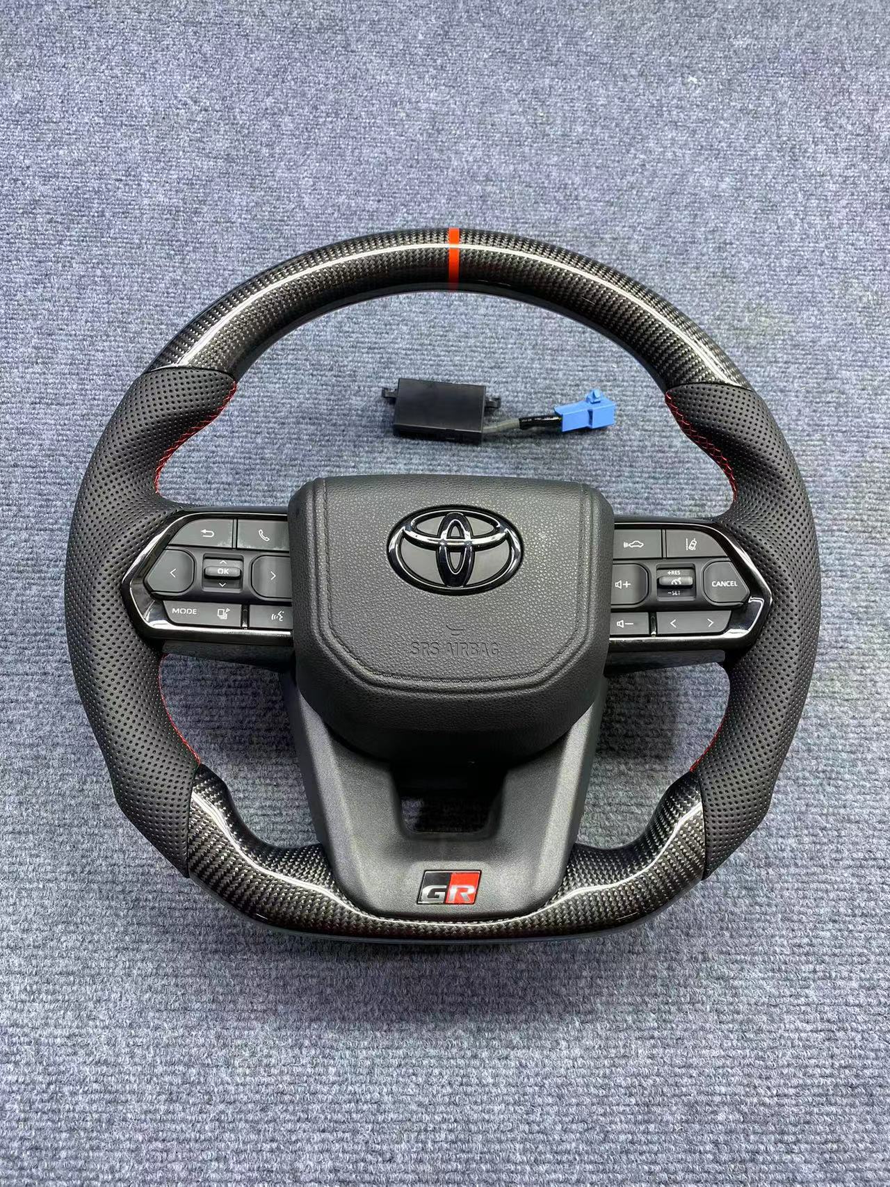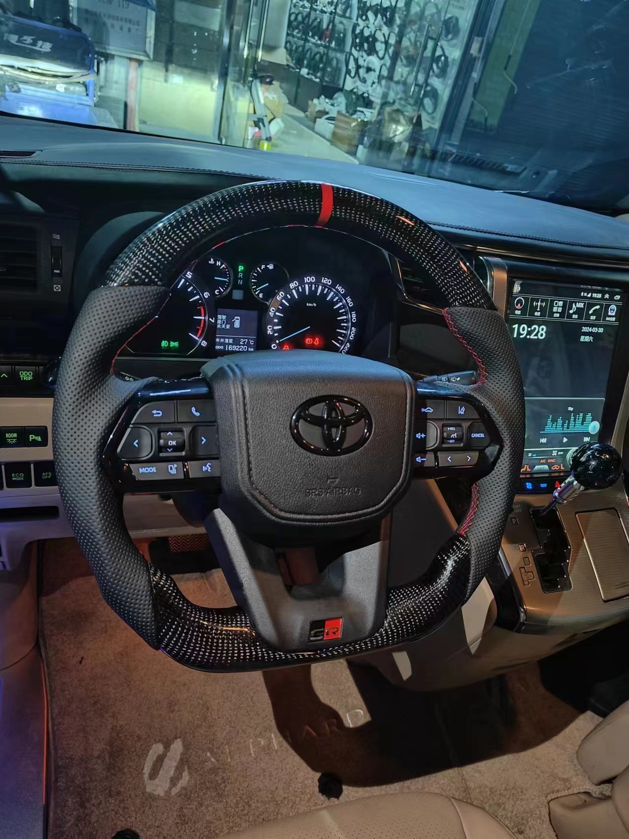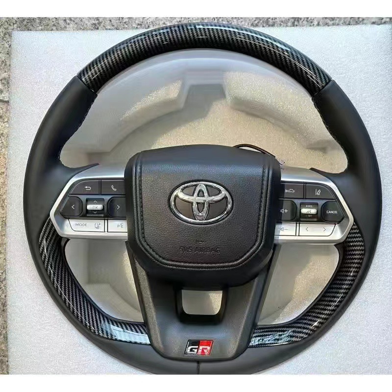 Upgrade your driving experience with this premium carbon fiber and wood grain steering wheel assembly designed for Toyota models including Land Cruiser and Prado.