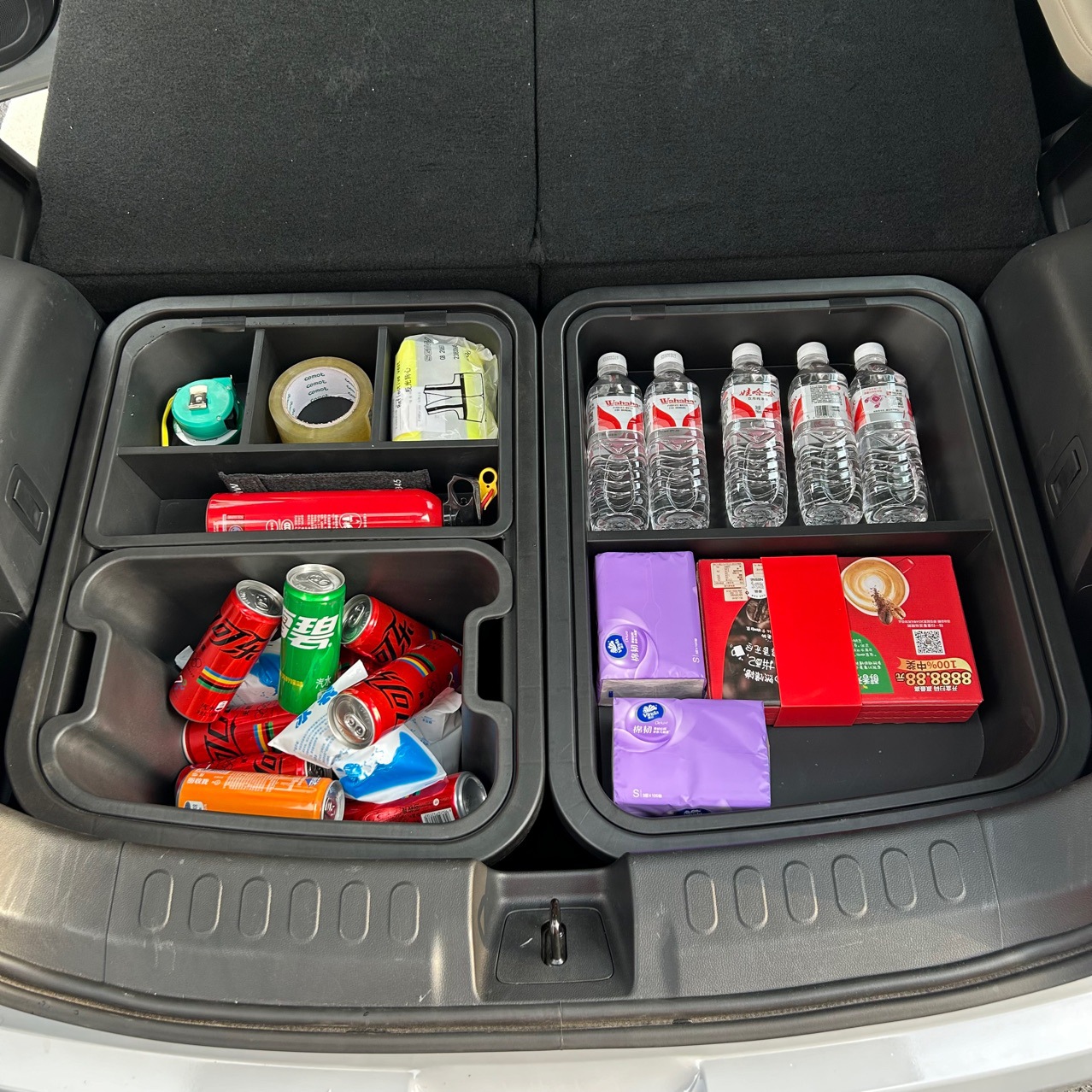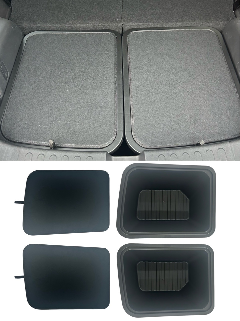 A: The set includes the storage bins and the corresponding top covers, ensuring your trunk floor remains flat and items are kept out of sight.