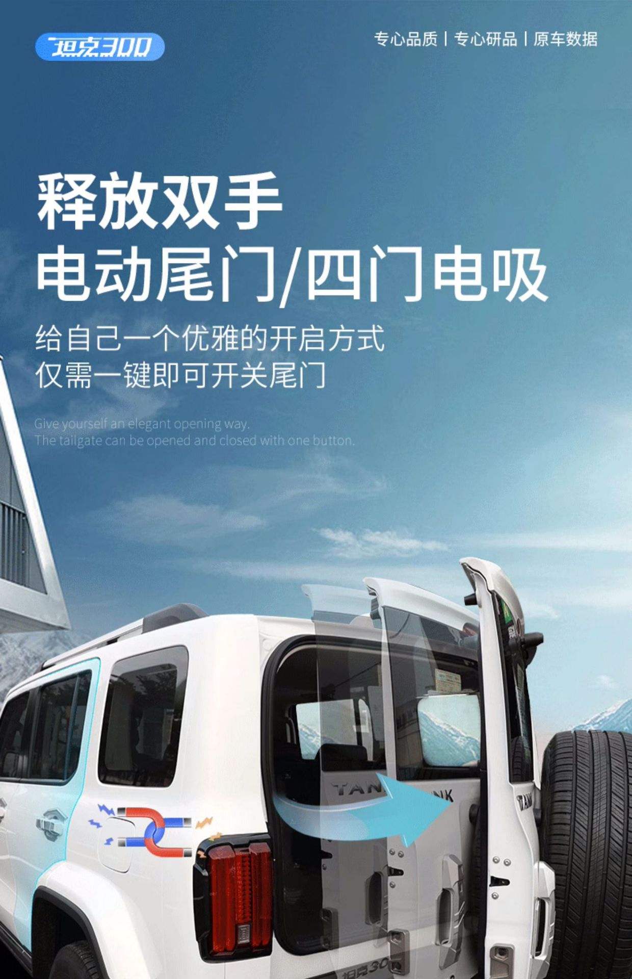 Upgrade your Tank 300 with this intelligent electric power tailgate lift system. Features soft-close suction technology and smart anti-pinch safety sensors.