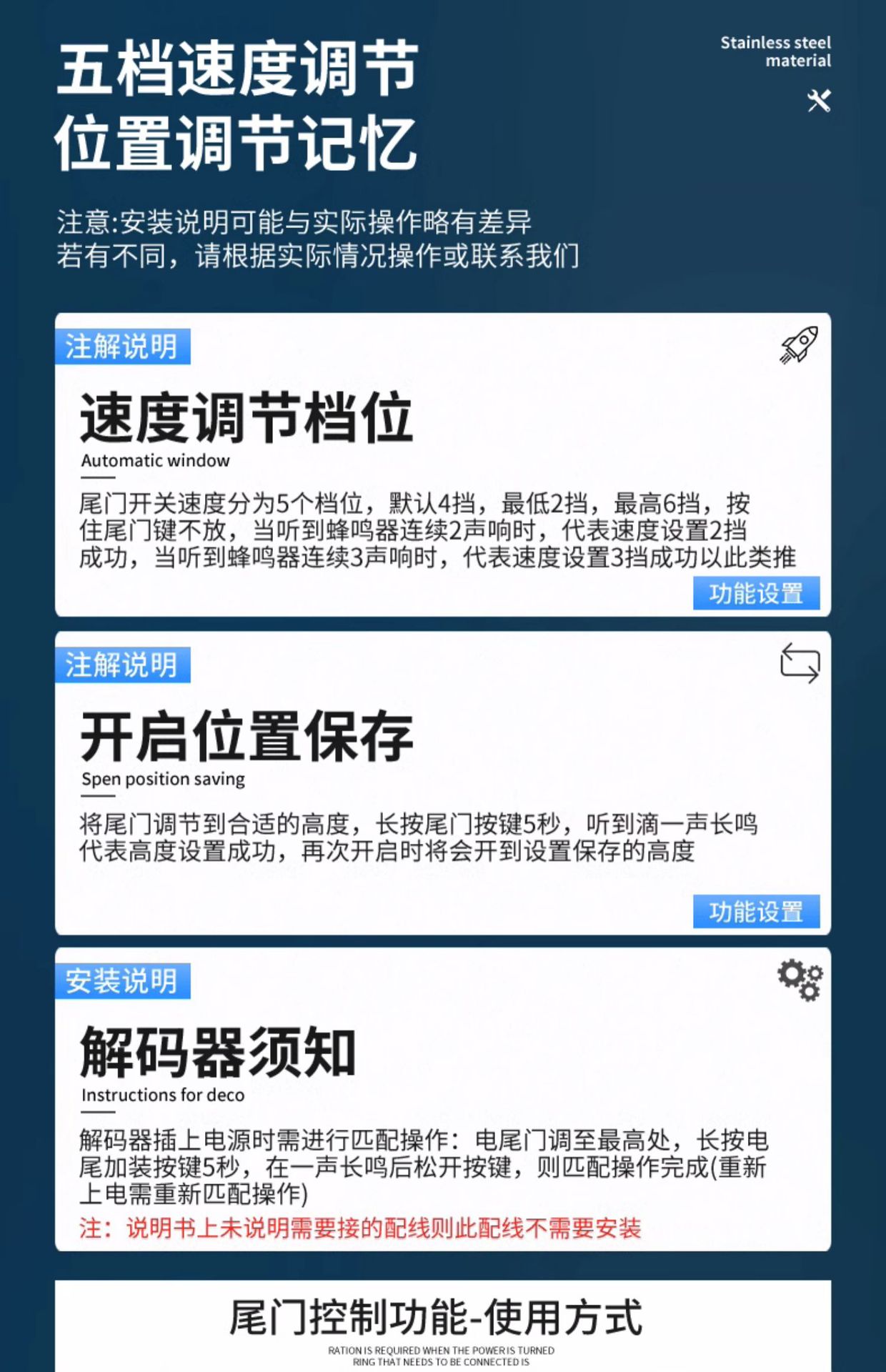 - Automatic Operation: Provides convenient hands-free opening and closing of the rear tailgate via remote control or internal button.