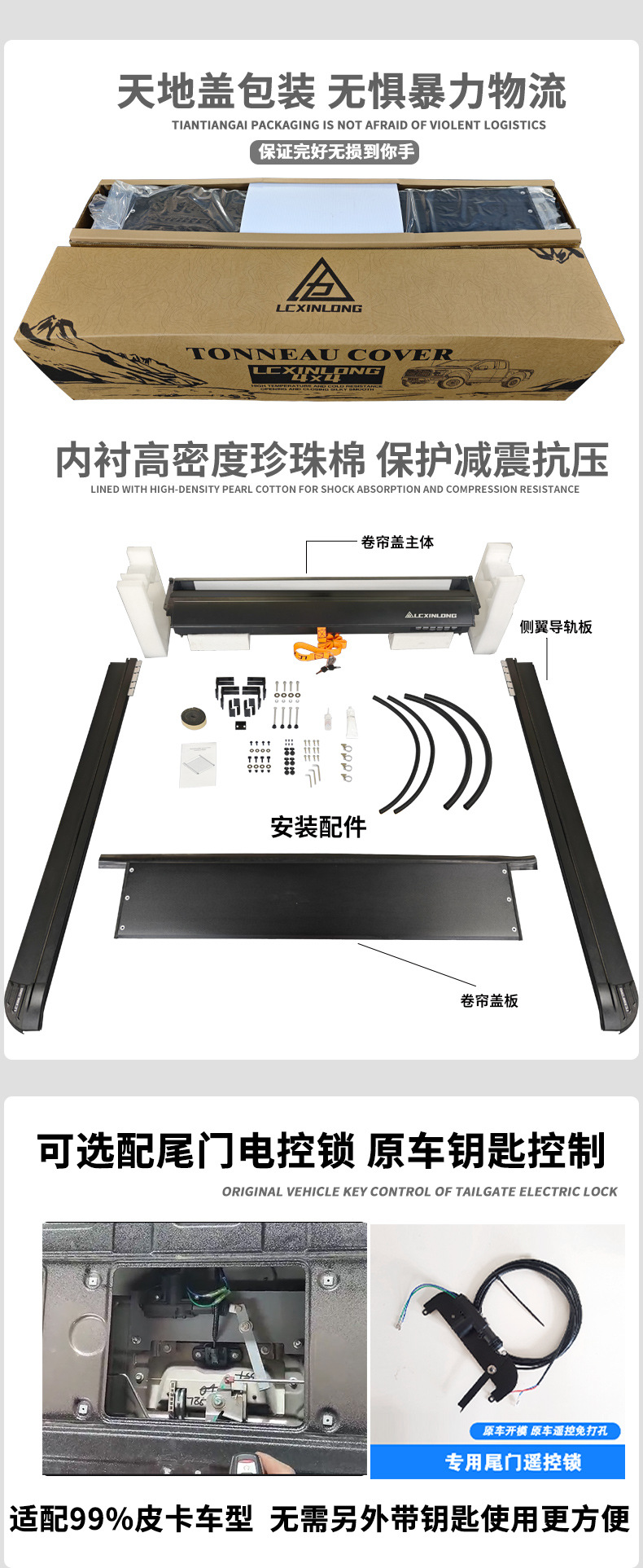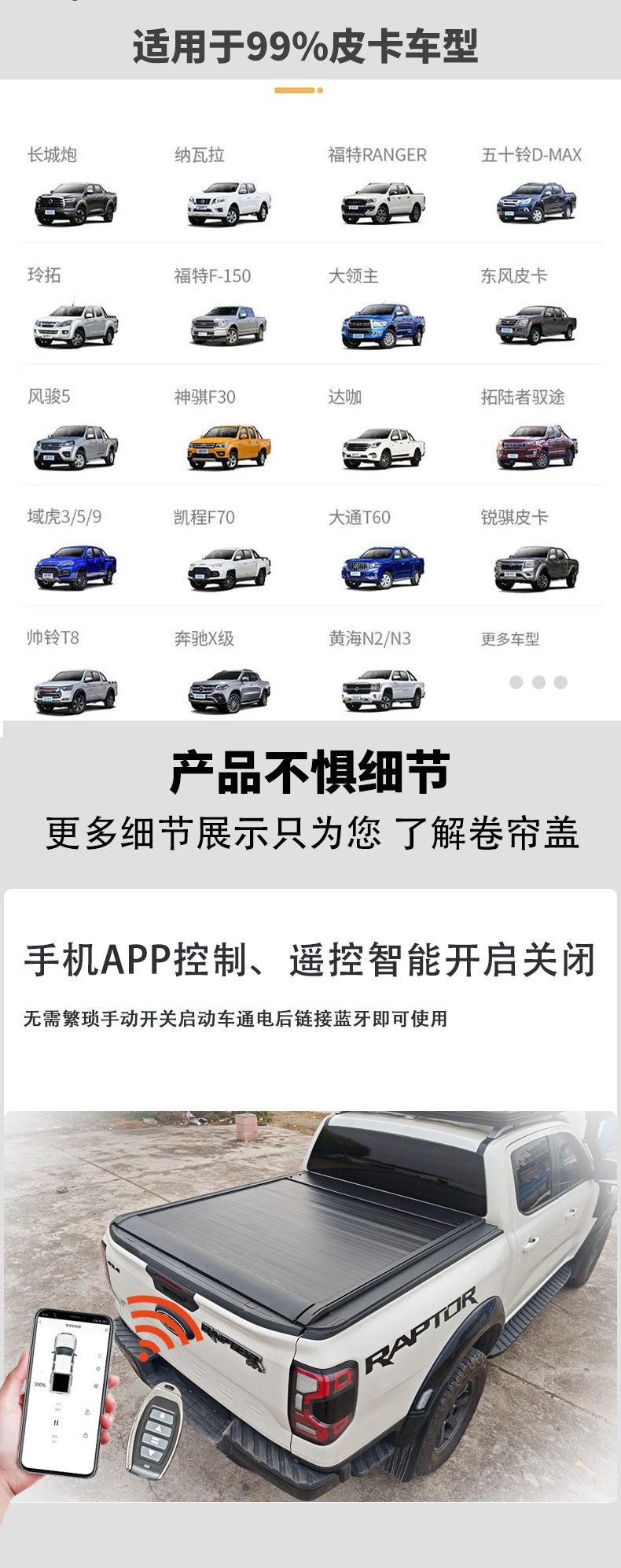- Remote-controlled electric operation for smooth opening and closing of the truck bed cover.
