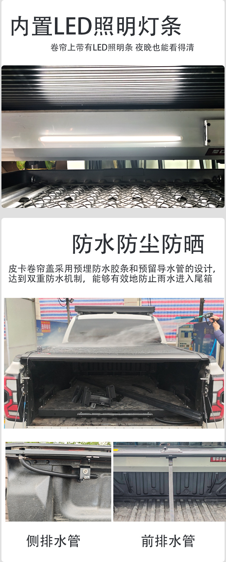 - Integrated water drainage system effectively channels rain away from the truck bed to keep your cargo dry and secure.