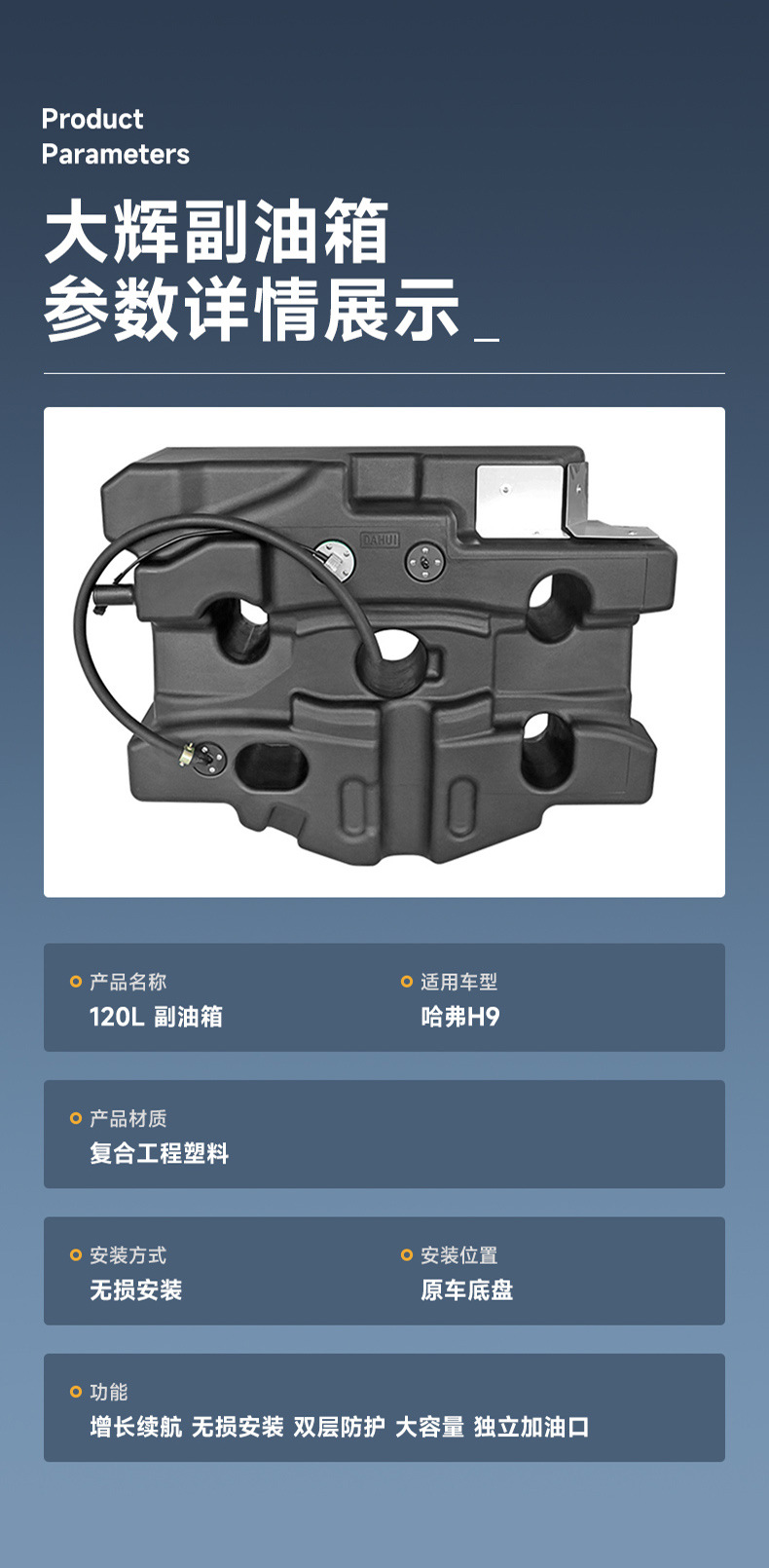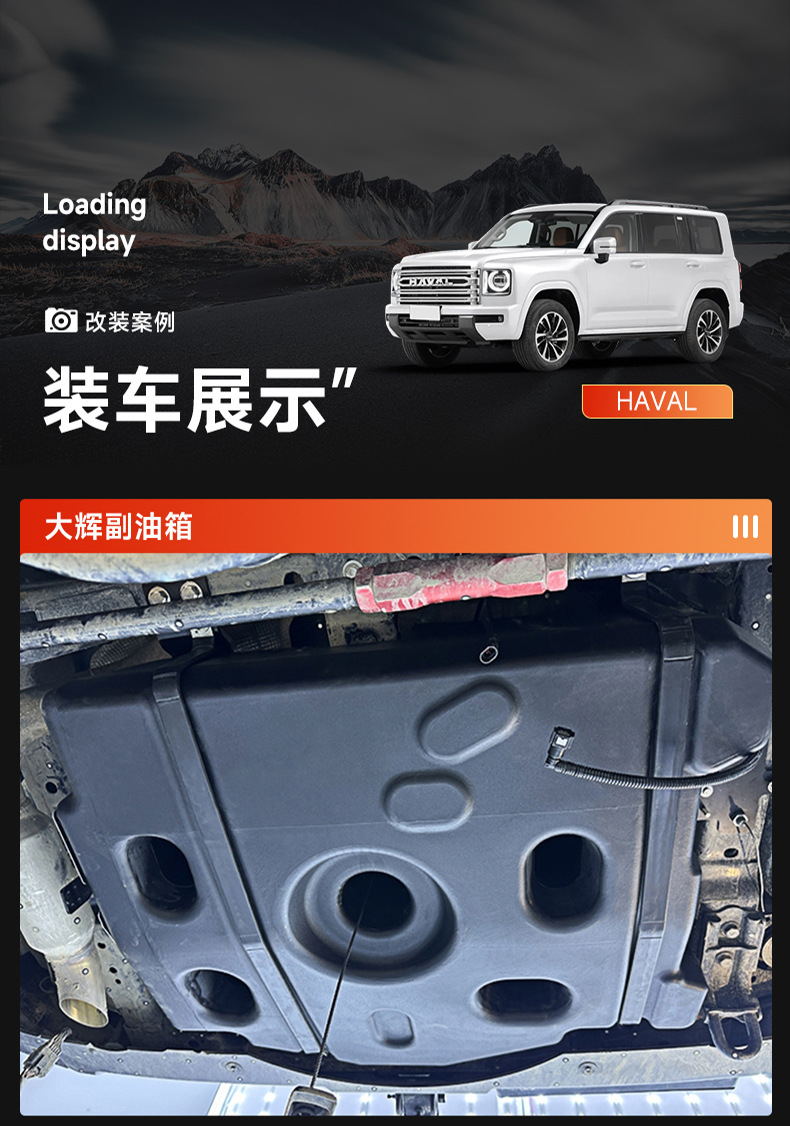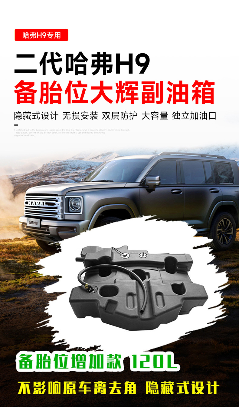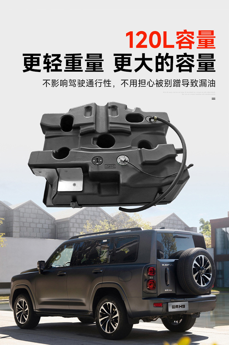 Tags: 120L spare fuel cell, auxiliary fuel tank, extended range gas tank, Haval H9 exterior accessories, off-road fuel reservoir, secondary fuel system