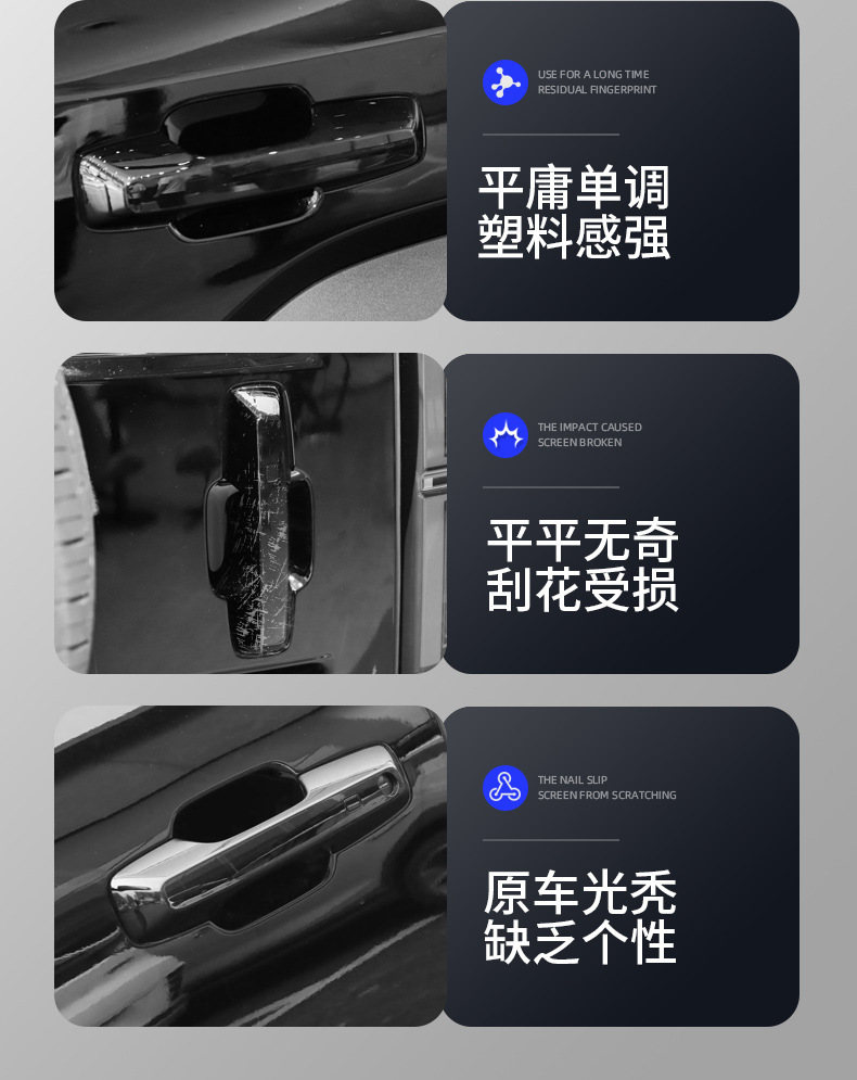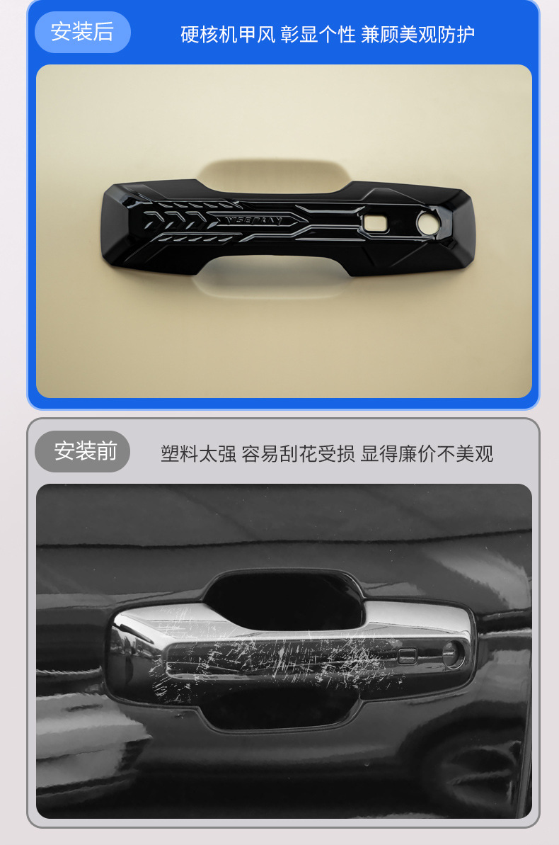 - Protects original door handles from scratches, wear, and environmental damage while upgrading the vehicle’s rugged aesthetic appearance.