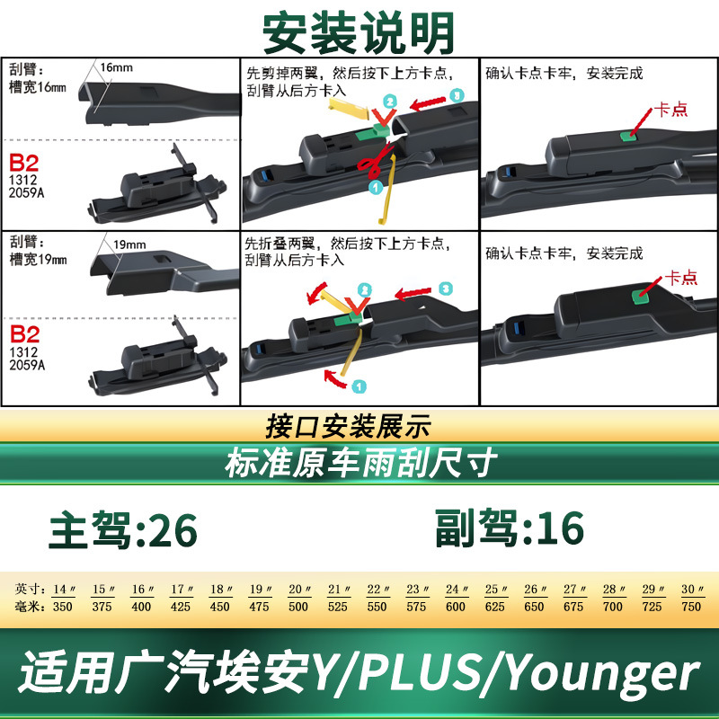 Frameless Windshield Wiper Blades for GAC AION Y / PLUS / Younger, Silent Natural Rubber Refills Front Window Wipers