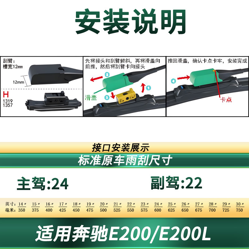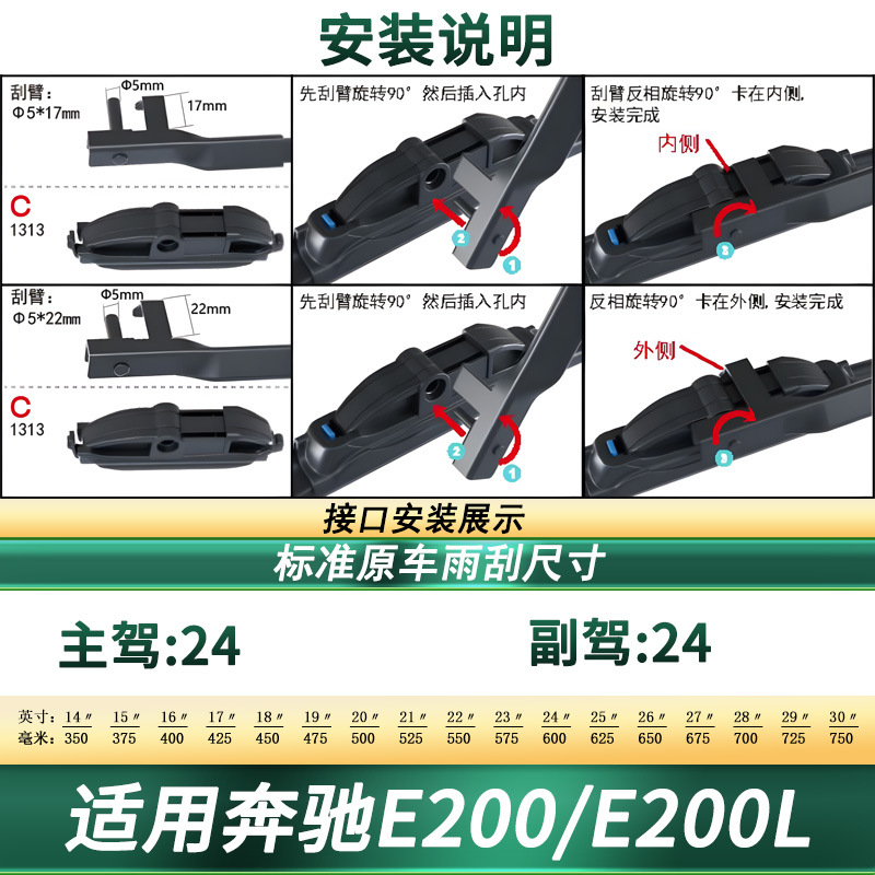 Upgrade your Mercedes-Benz E200/E200L with these premium frameless windshield wiper blades. Featuring silent natural rubber for clear visibility in all weather.