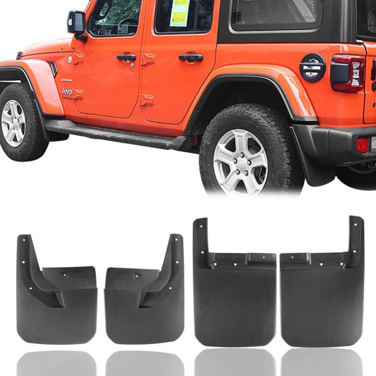 Protect your 2018-2024 Jeep Wrangler JL with this 4-piece mud guard set. Made of durable PP plastic to block debris and mud. Easy no-drill installation.