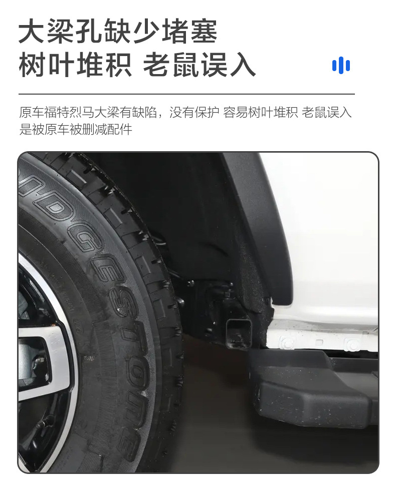 - Maintains vehicle cleanliness and helps prevent long-term corrosion within the frame and axle housing.