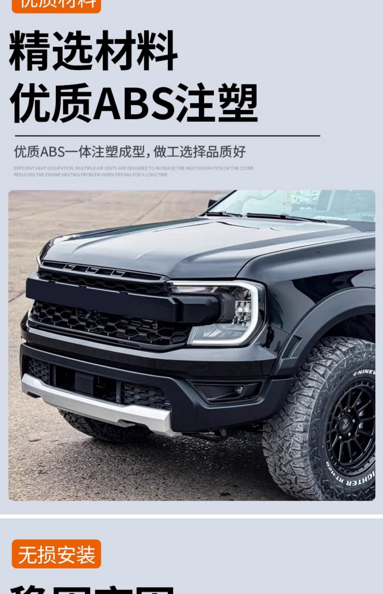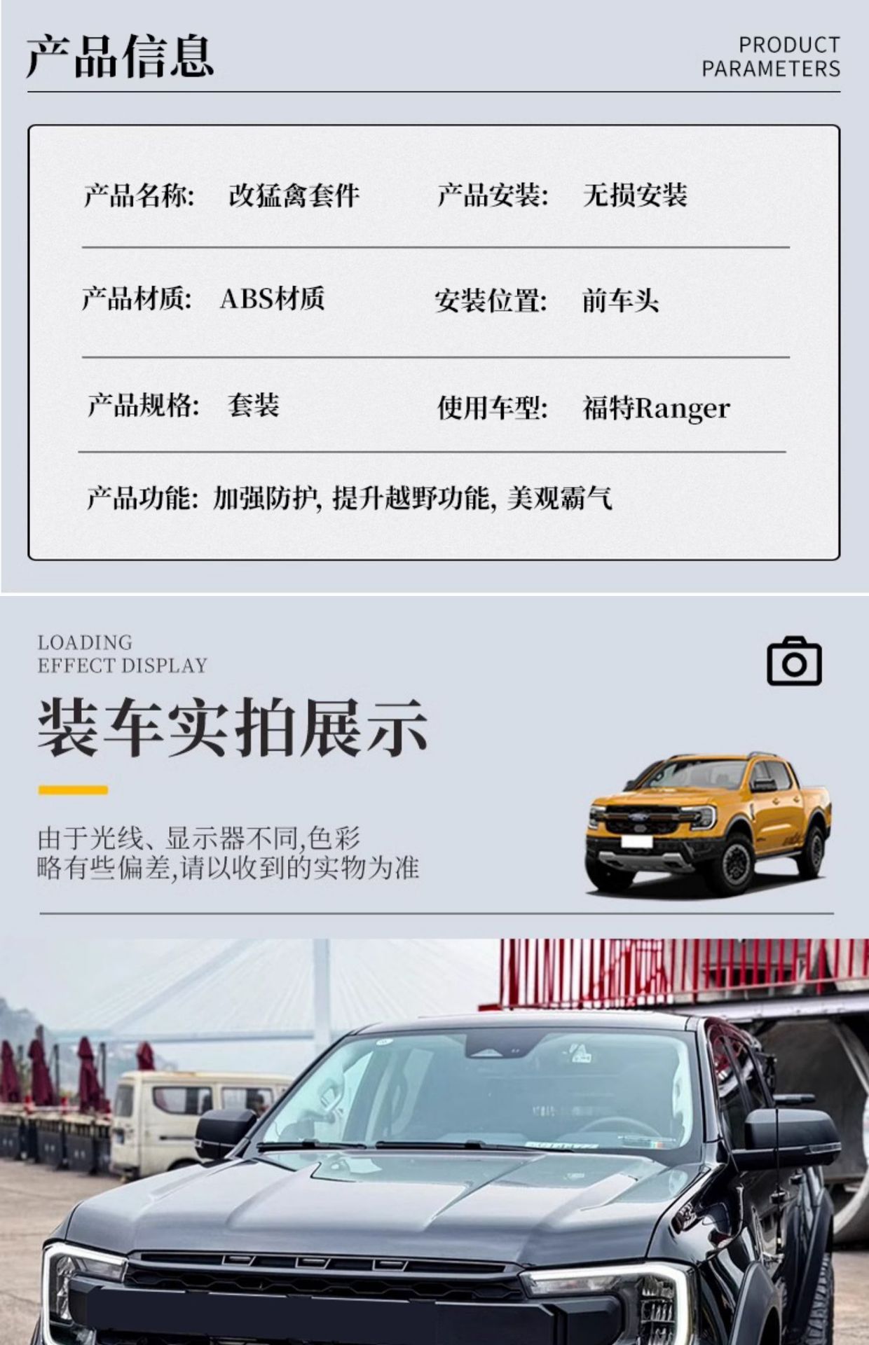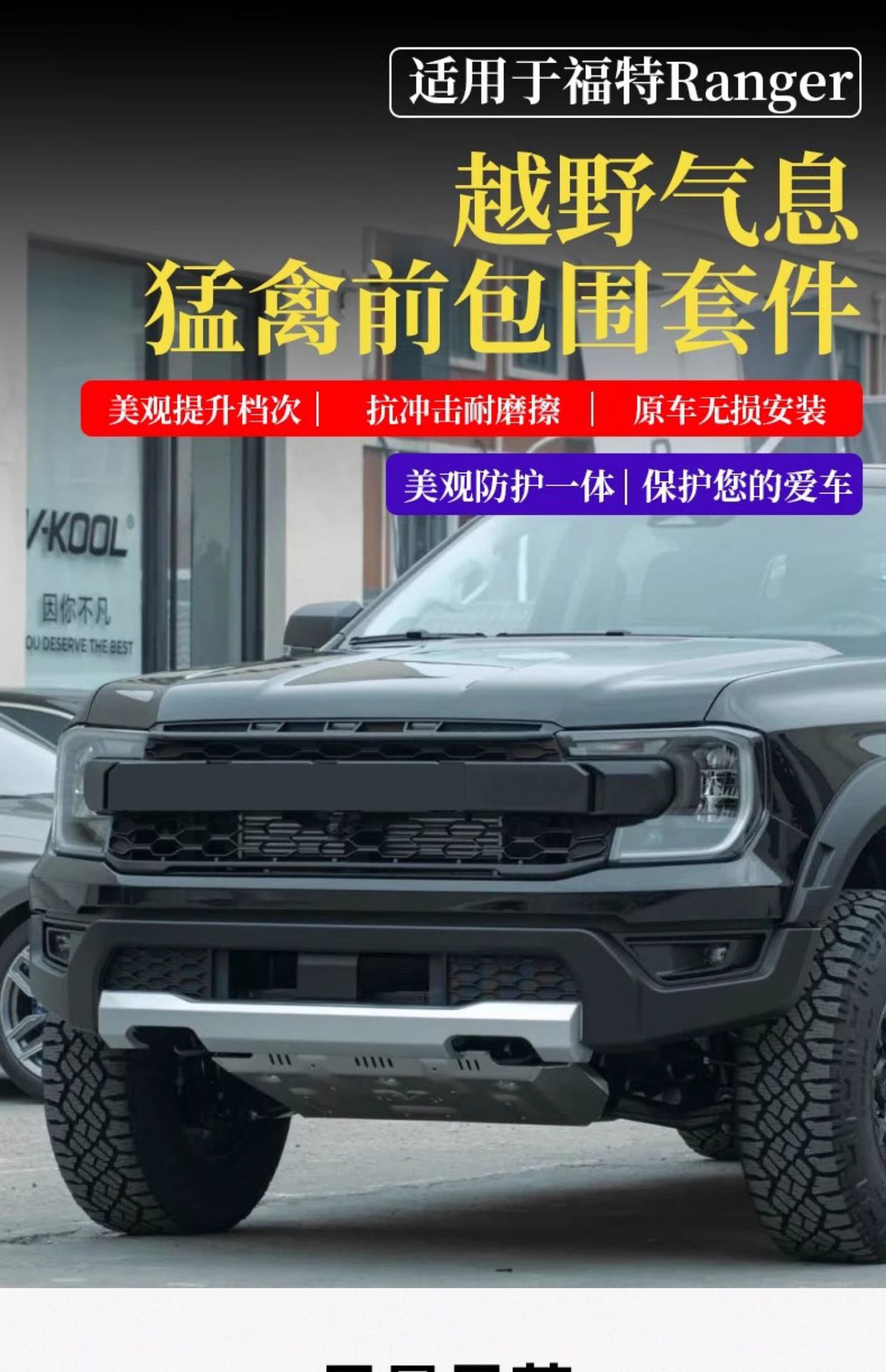 - Complete Raptor conversion kit designed specifically for the Ford Ranger to enhance off-road aesthetics.
