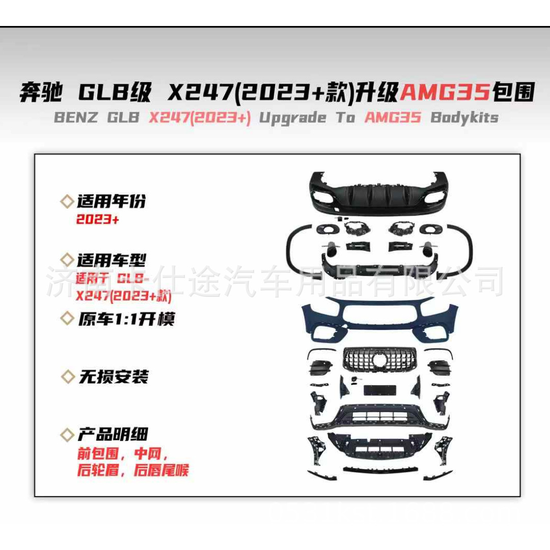 - Includes essential components such as lower grilles and trim pieces required for a comprehensive GLB35 look conversion.