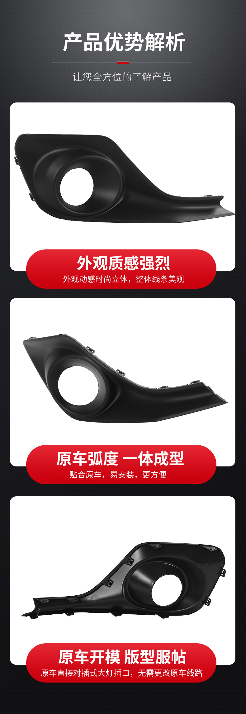 - Serves as a protective housing and aesthetic enhancement for the front bumper fog lamp area against road debris.