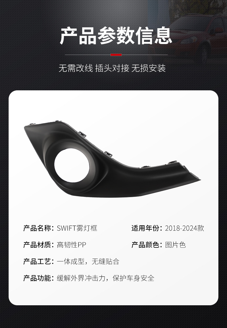 - Precision-engineered fog light bezel designed specifically for Suzuki Swift 2018-2024 models to ensure a seamless exterior look.