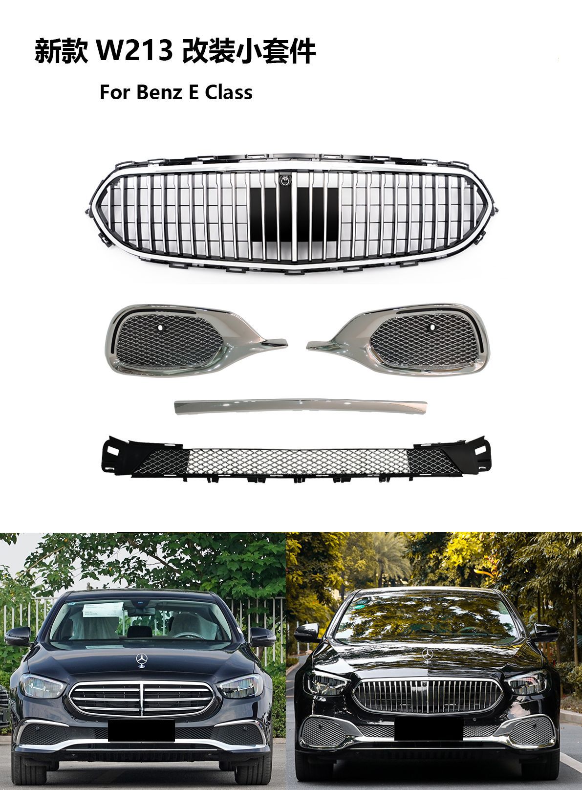 - Precision-engineered front radiator grille specifically designed for the updated 2021+ E-Class W213 chassis architecture.