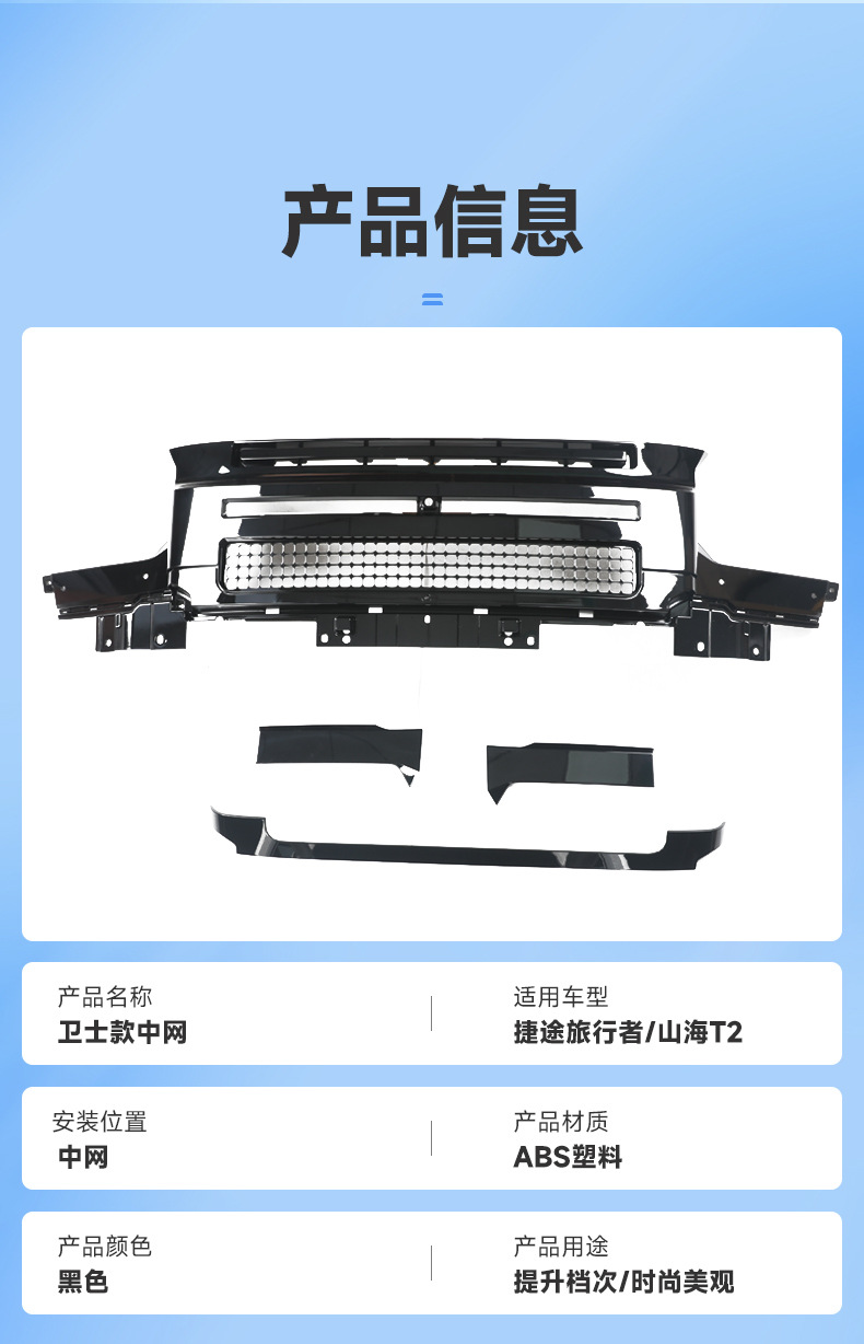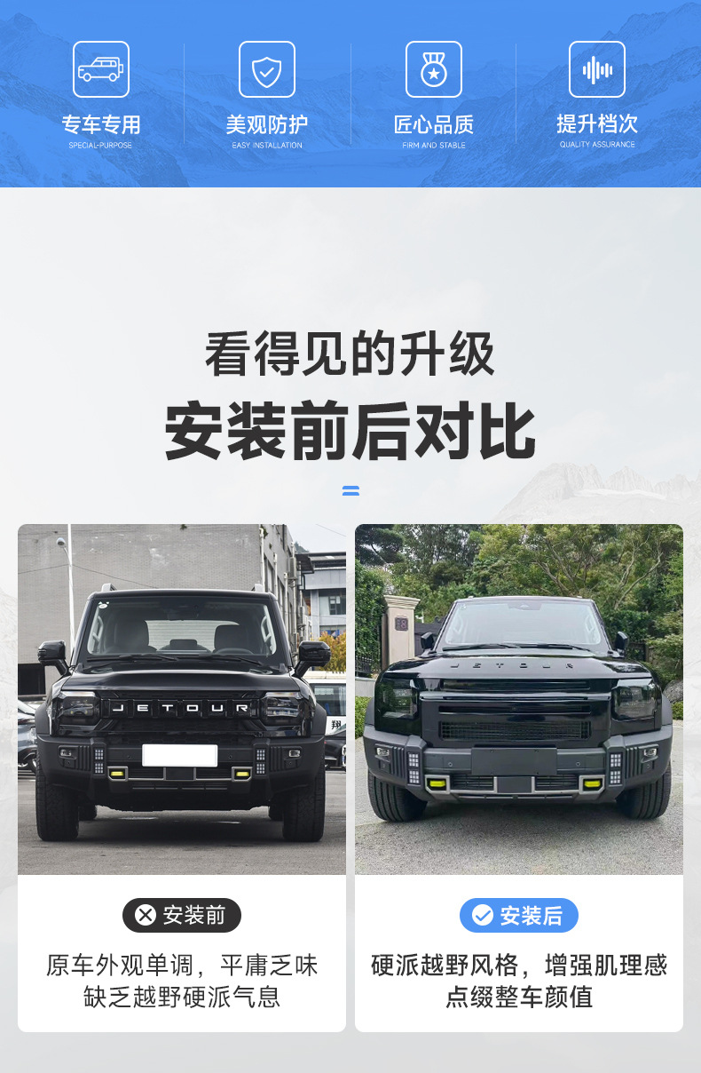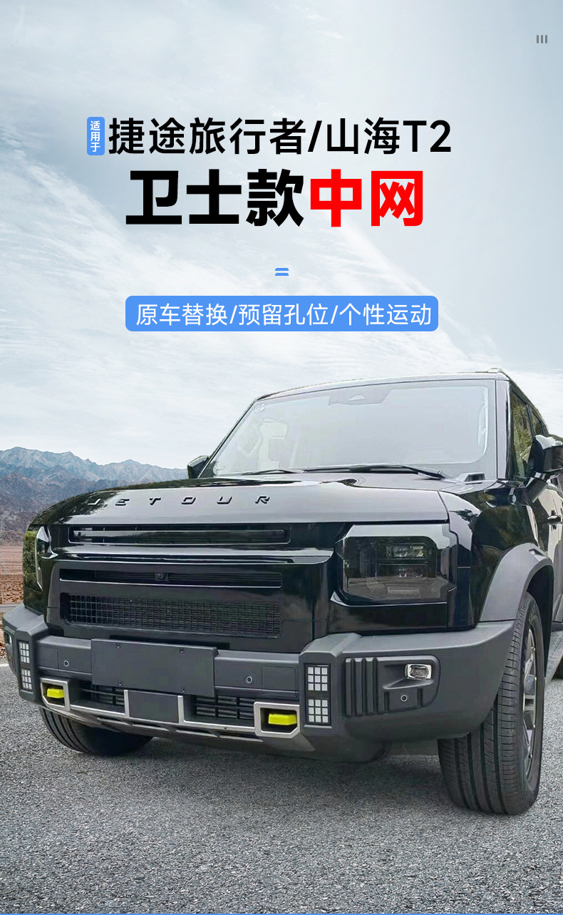 - Specifically designed for Jetour Traveller Shanhai T2 providing a seamless exterior upgrade and rugged off-road aesthetic.