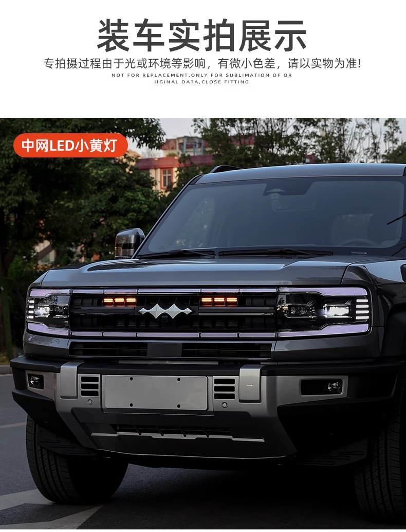 - Customized for Fang Cheng Bao 5 front grille to enhance visibility and off-road aesthetic during day or night driving.