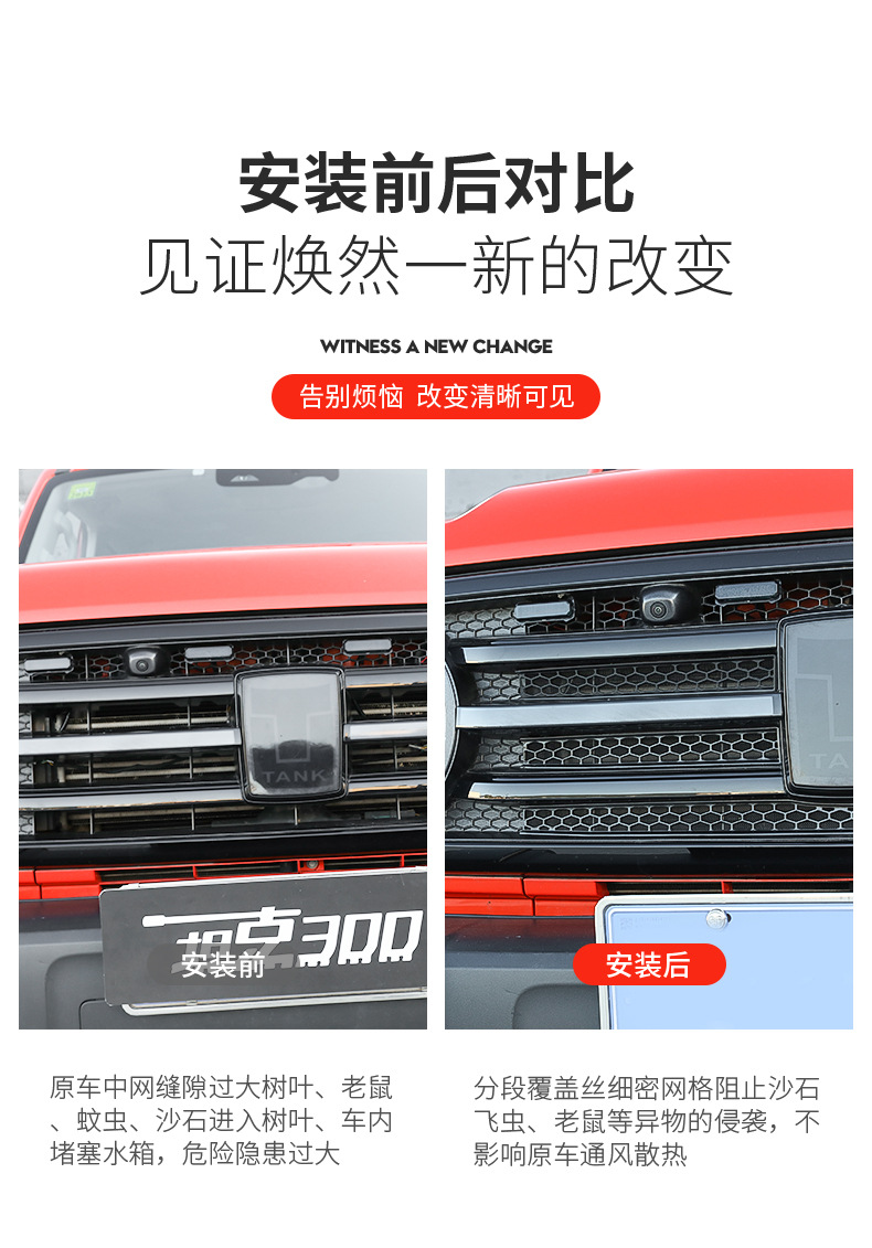Upgrade your Tank 300 with this honeycomb front grille insect screen. Durable mesh protection prevents debris damage while enhancing your vehicle’s exterior style.