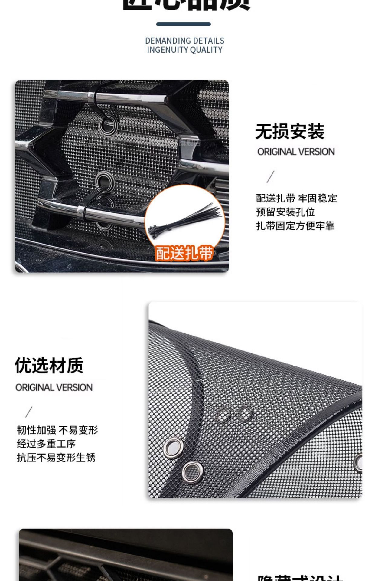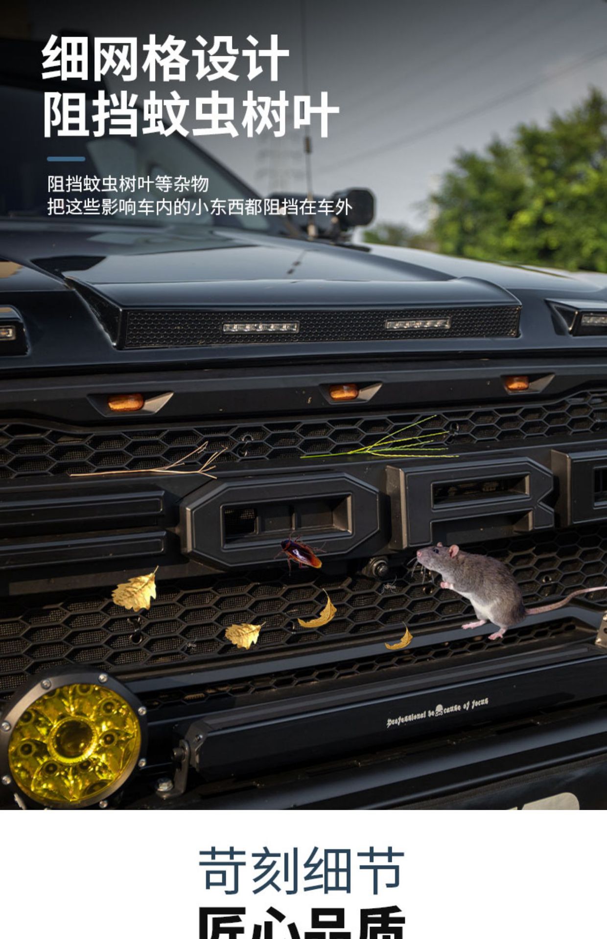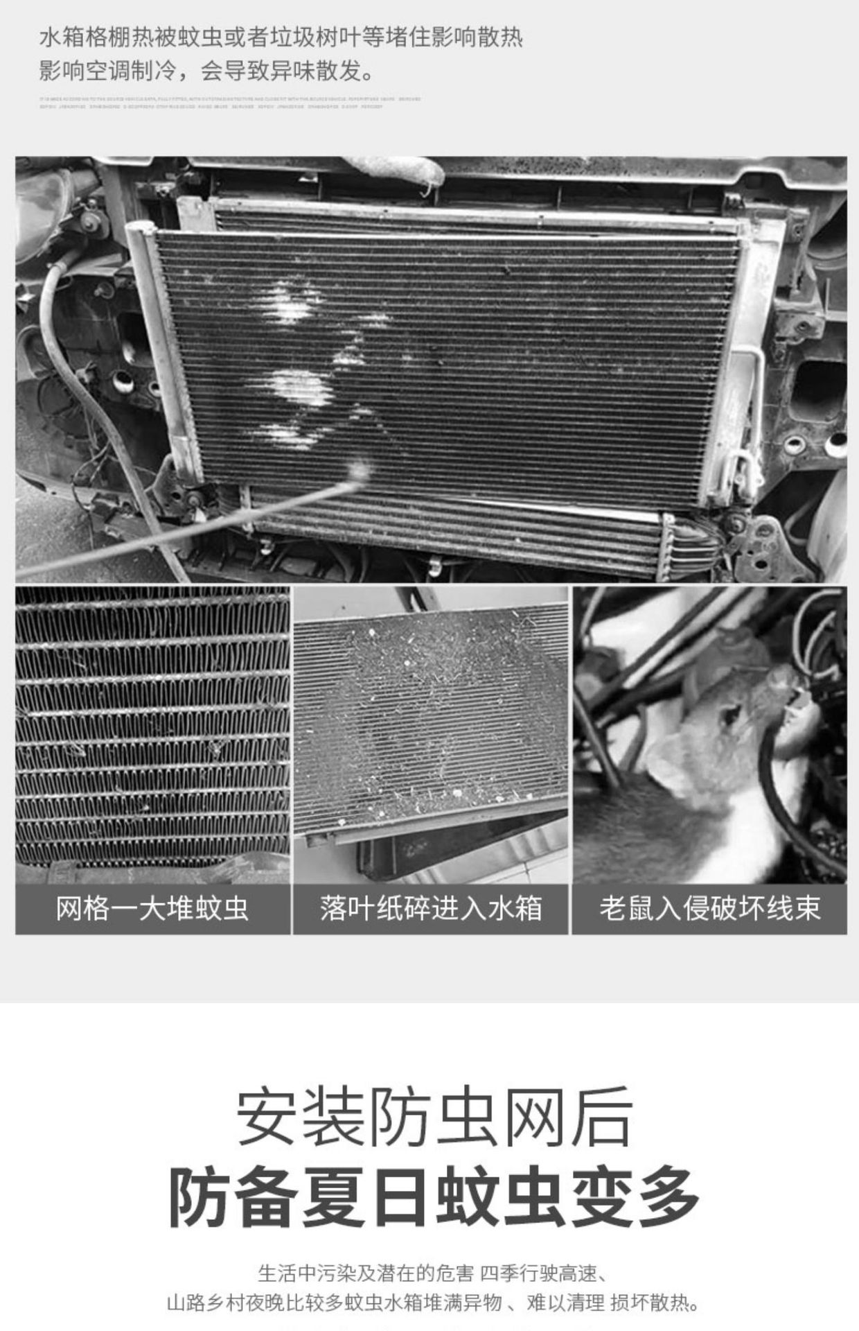 - Functions as a barrier against insects, leaves, and small stones to protect the radiator and AC condenser.