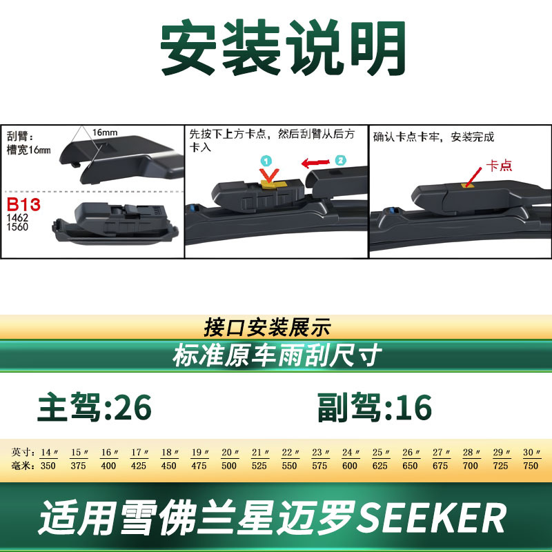 - Custom fit design specifically engineered for Chevrolet Seeker models ensures seamless compatibility with the original wiper arm.