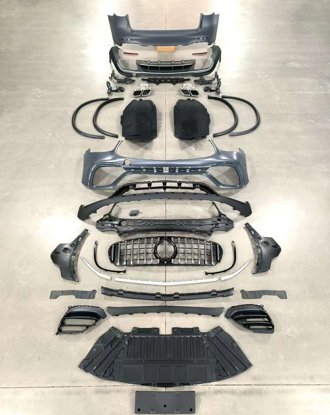 - Complete exterior upgrade package featuring front and rear bumper assemblies designed for a sporty AMG-inspired aesthetic.