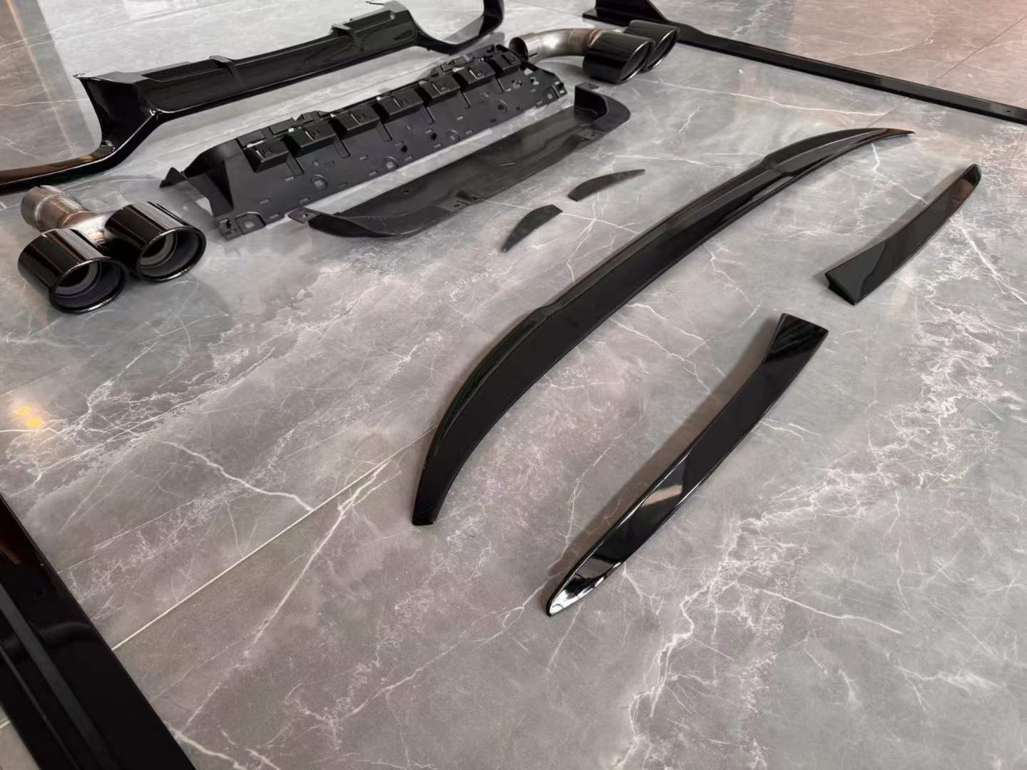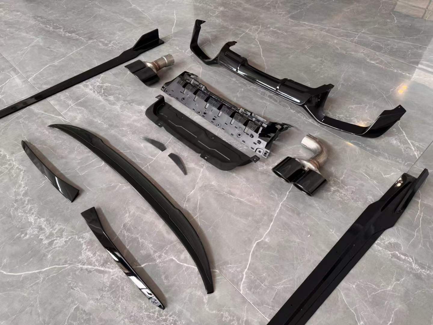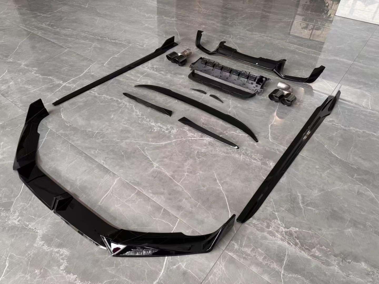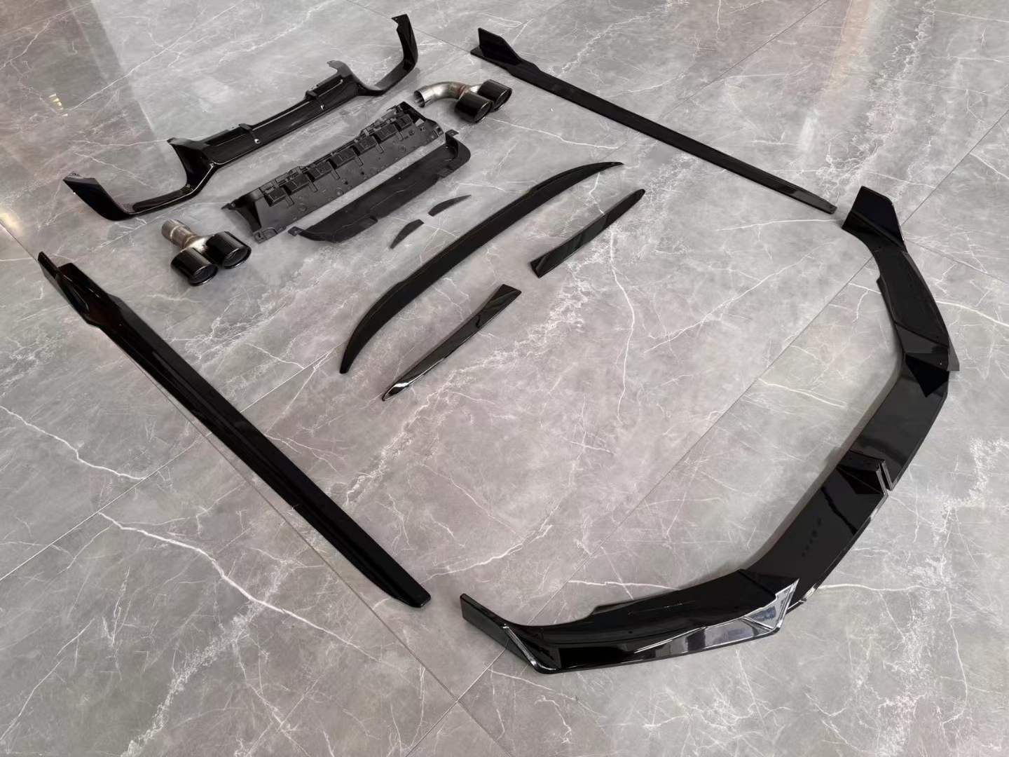- Full exterior aerodynamic upgrade includes front lip, side skirts, rear diffuser, and trunk spoiler for a cohesive aesthetic.