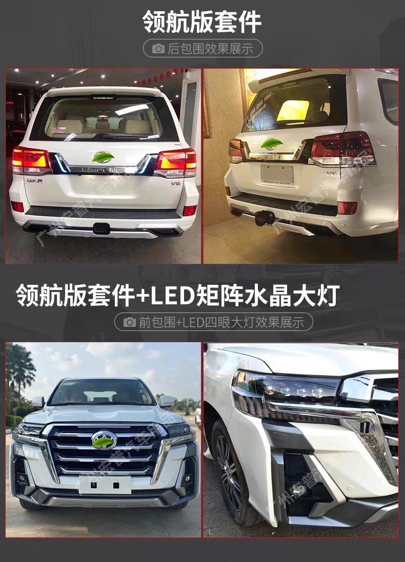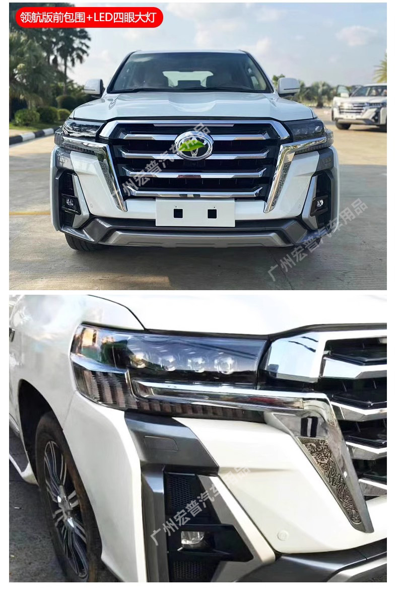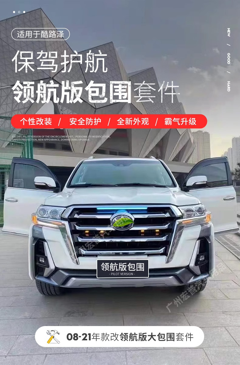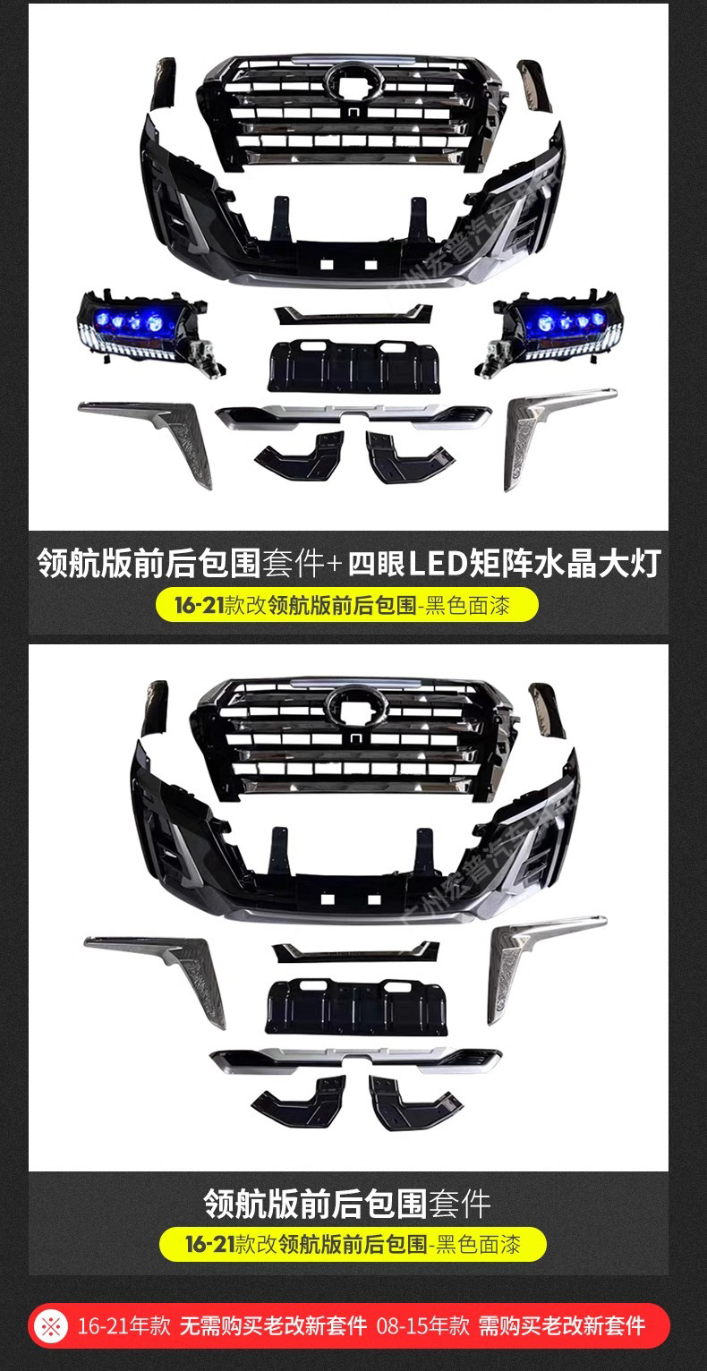 - Complete exterior transformation kit designed specifically for Land Cruiser 200 series models from 2008 to 2021.
