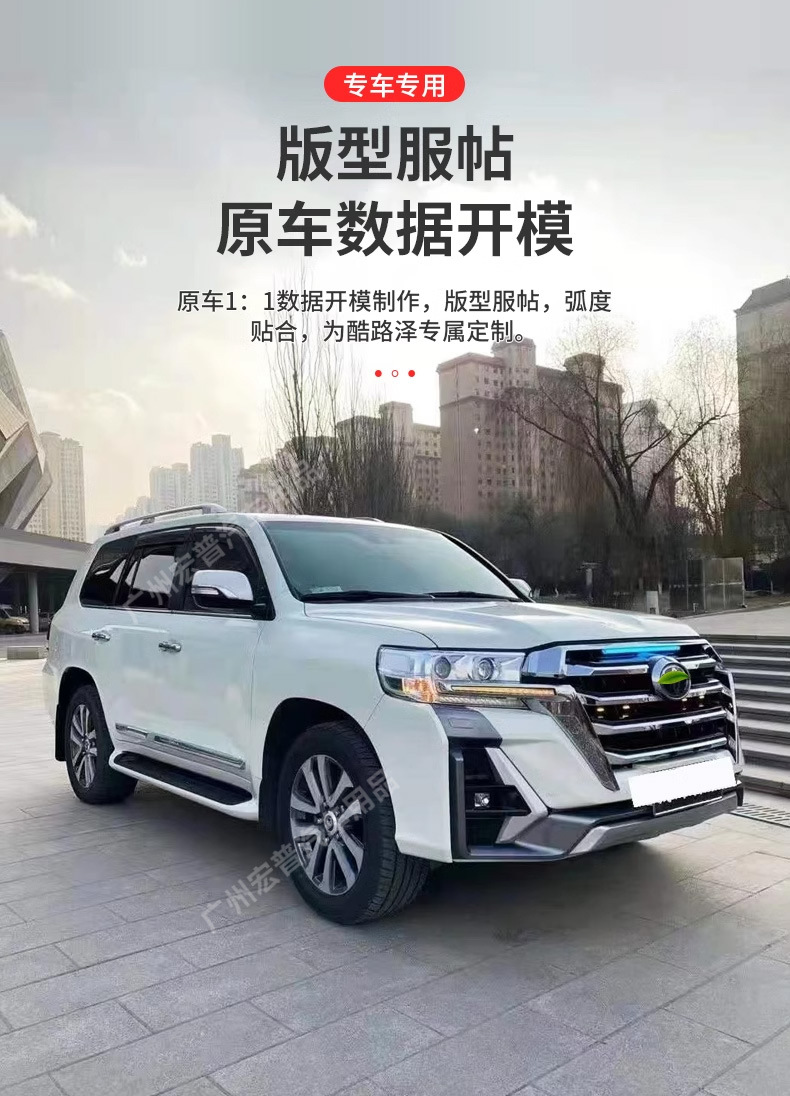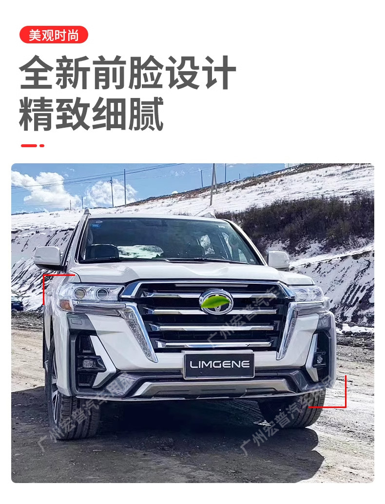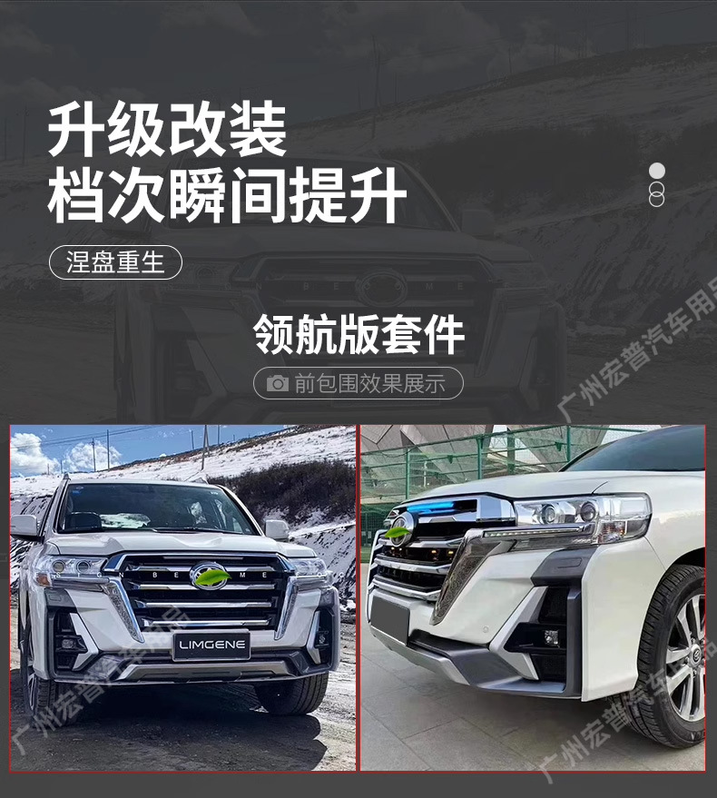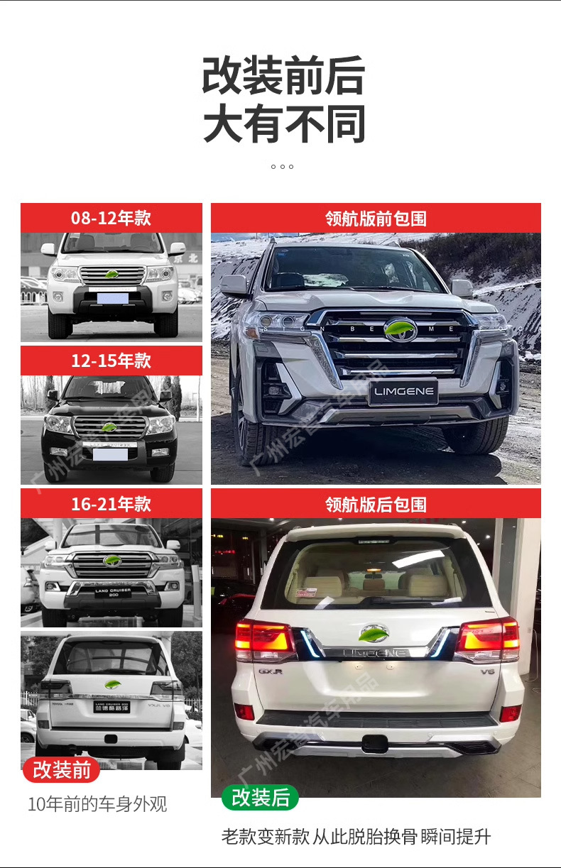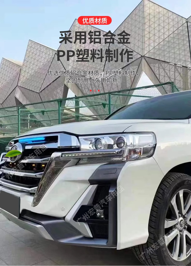 - Complete exterior transformation kit designed specifically for Land Cruiser 200 series models from 2008 to 2021.