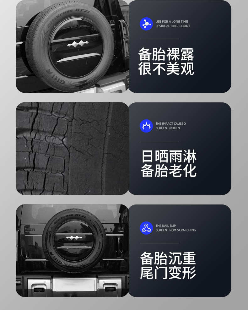 • Full-enclosure structure preserves the integrity of the spare wheel, preventing oxidation and premature aging of the rubber.