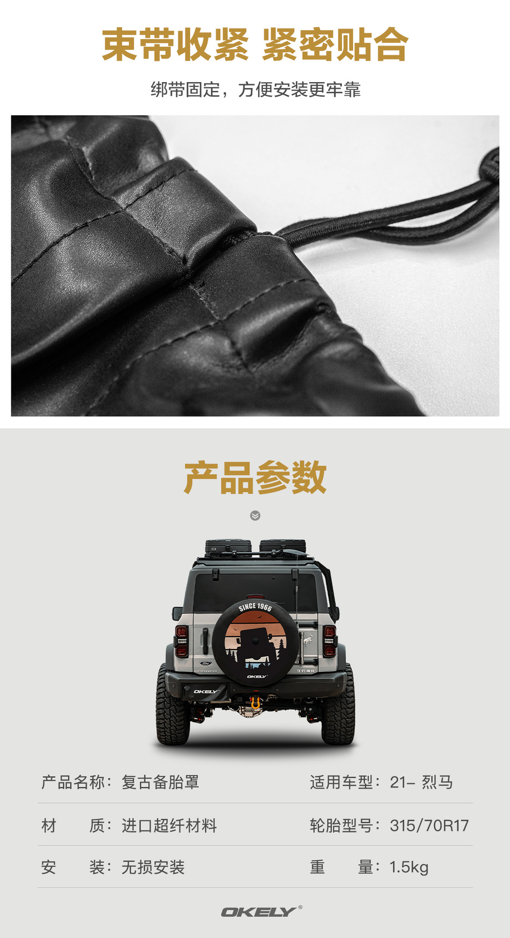 Upgrade your off-road vehicle with this full coverage spare tire cover. Durable, weather-resistant protection and sleek tailgate styling for Ford Bronco models.